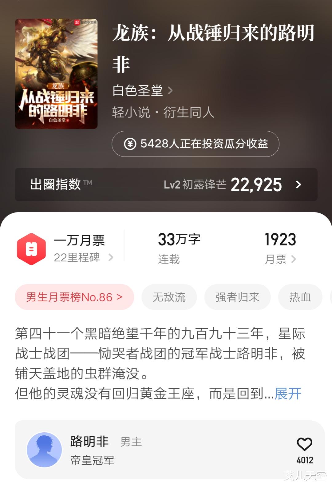 顺带说一下他的这本新书,上个月上架的,路明非宇宙的一员,看着也有万订的成绩。