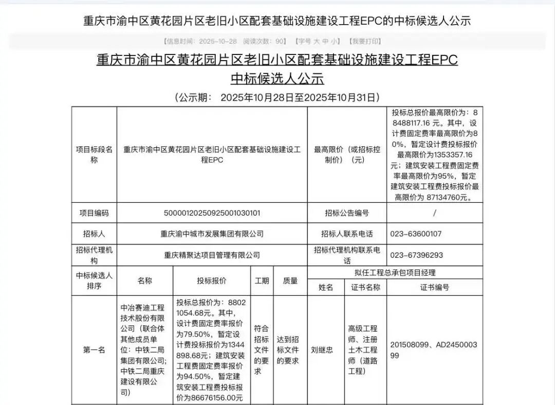 重庆市公共资源交易监督网正式公示了“重庆市渝中区黄花园片区老旧小区配套基础设施建设EPC项目”的中标结果。