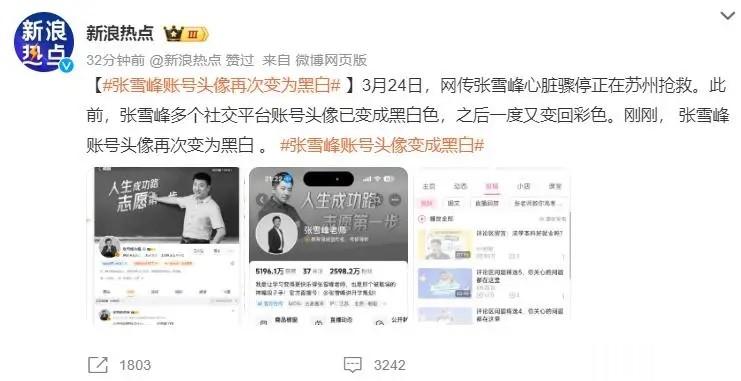 3月24日,有网友爆出知名教育博主、考研导师张雪峰因身体不适被送往苏州当地医院抢救。