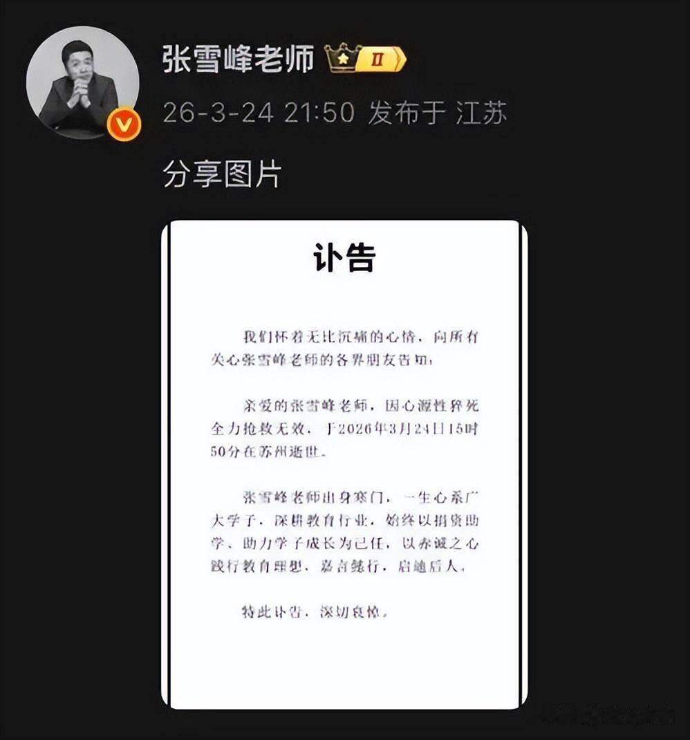 但是,到了当天深夜,噩耗传来,苏州峰学蔚来公司发布讣告,张雪峰老师因心源性猝死,全力抢救无效,于当天15时50分在苏州逝世。