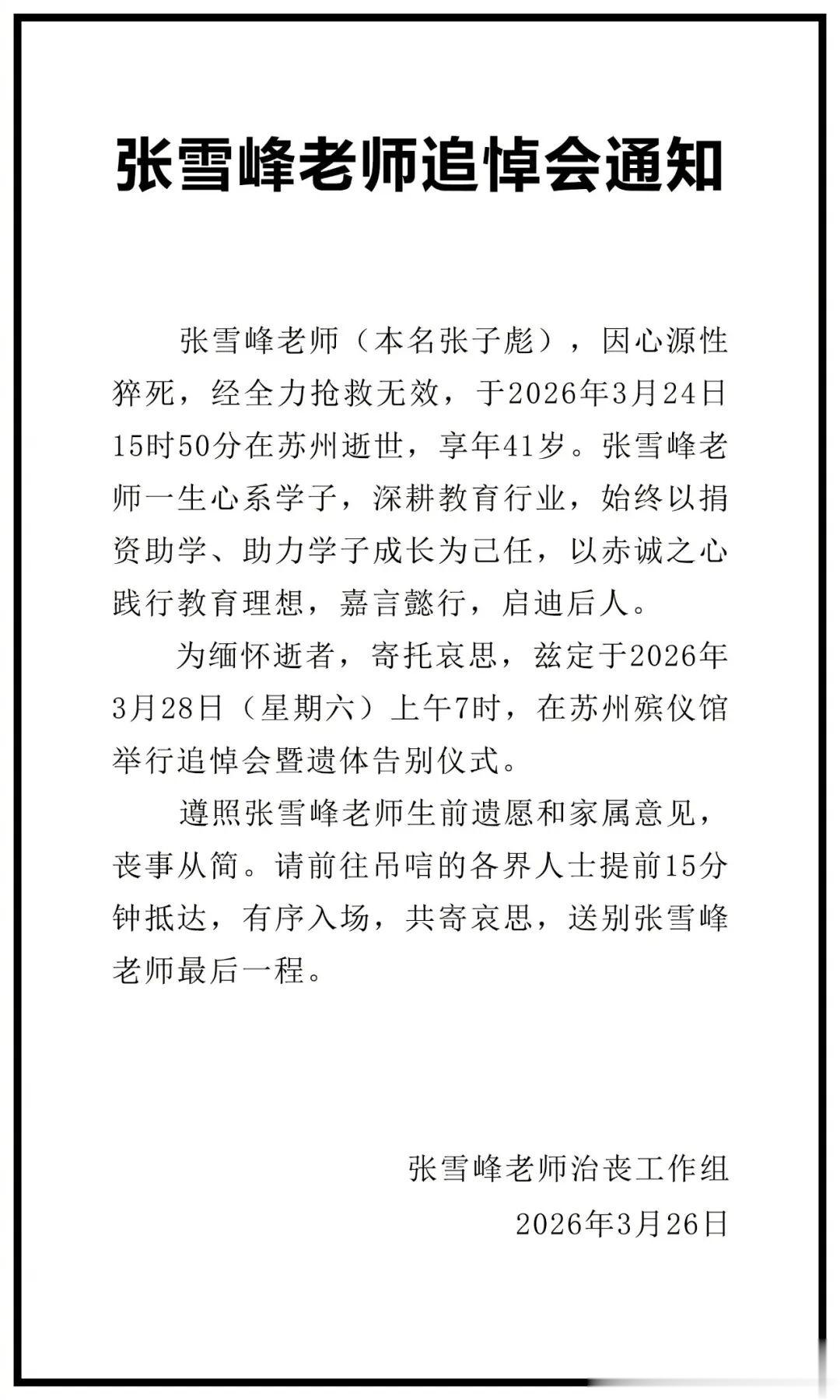 3月26日,张雪峰治丧工作组发布通知,其追悼会3月28日(周六)上午在苏州殡仪馆举行。根据张雪峰老师生前遗愿,以及其家属意见,丧事从简。