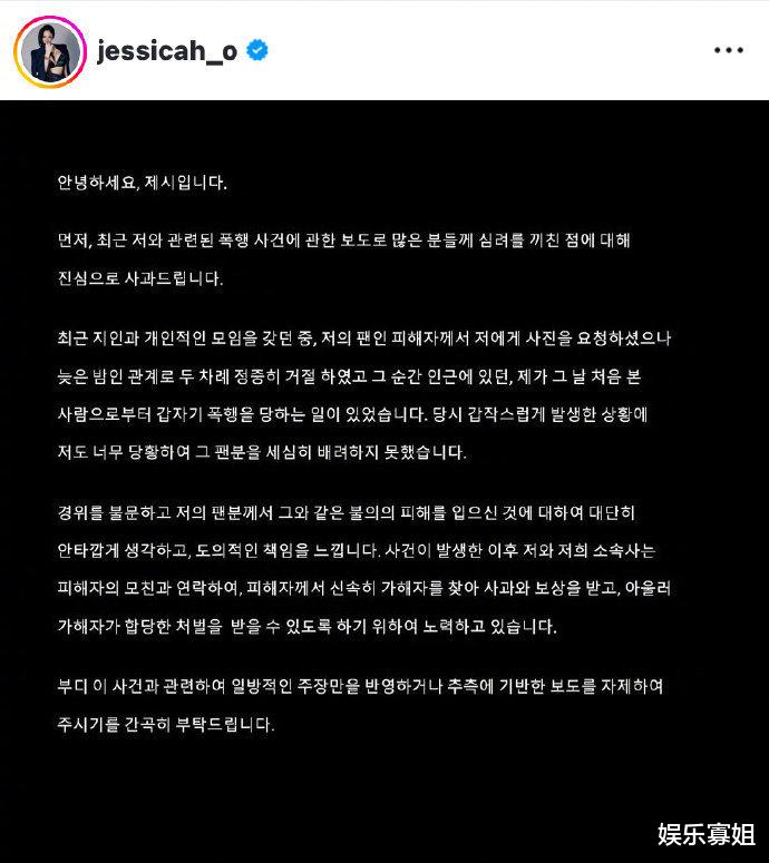 嗨!这里是娱乐寡姐,为你带来最新娱乐资讯。韩国JTBC新闻《事件班长》曝Jessie同行人员殴打粉丝一事,引发网友热议。报道称在9月29日凌晨,粉丝(18岁)街头见到Jessi,于是请求合影,却遭到对方同行人中一男性用英文辱骂,Jessi制止了此人行为并向粉丝道歉,但是这个时候另一位男性跑过来击打了该粉丝。该粉丝称Jessi当时并没有阻止,对Jessi感到失望。等警察来的时候,加害者和Jessi都已从现场消失。