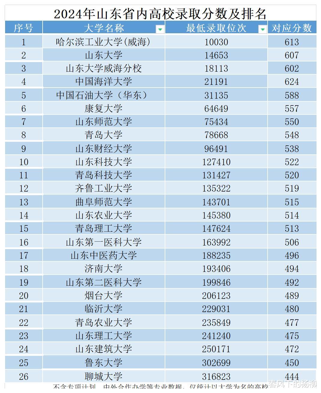 今天,咱们根据山东省各高校的最低录取分数来给山东高校排一个名次。同时,也根据软科2024中国大学排名,整理了山东省高校的排名情况,大家看看这两个版本的排名,哪一个更有参考价值吧。