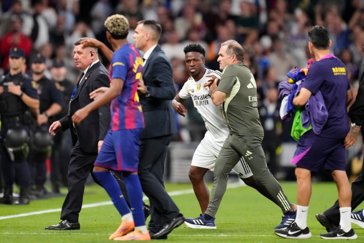 当值主裁索托的哨声尚未响起,场上场下的较量已演变成多线程混战。皇马教练组成员阿隆索既要将维尼修斯拉回本方区域,又需阻拦试图重返战局的米利唐。看台上尚未痊愈的阿拉巴、吕迪格,以及刚刚伤退的拉菲尼亚,这些理应保持中立的伤员都卷入了场边纷争。警察最终采用物理隔离的方式,将两队替补席控制在各自半区。