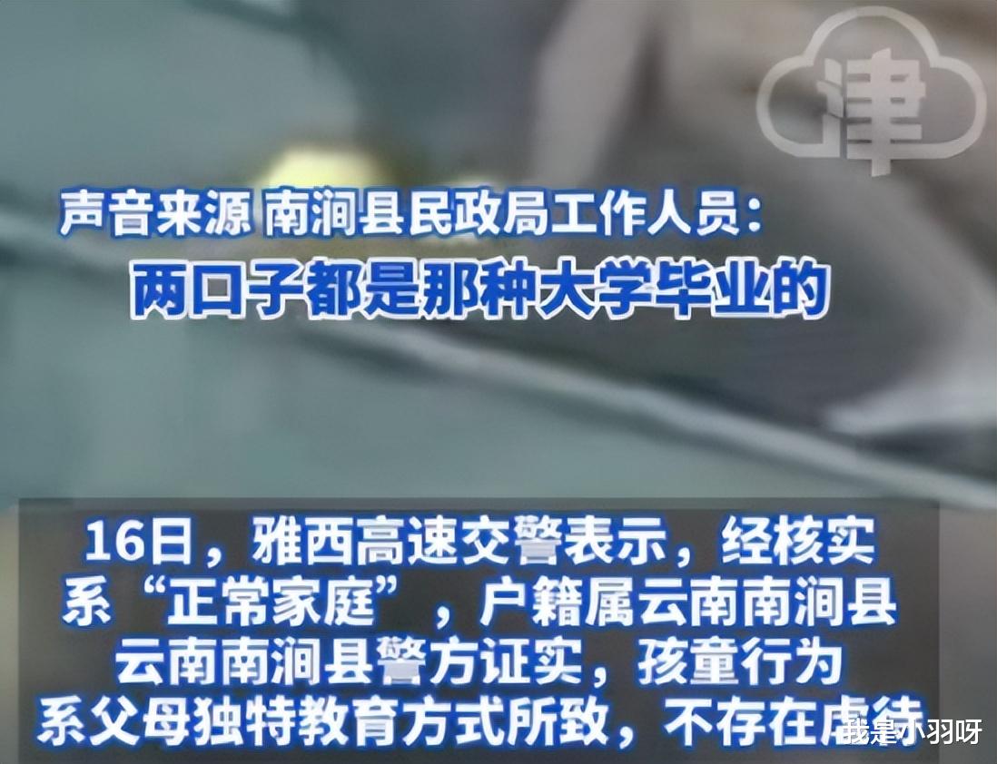 后来,四川当地警方介入调查,确认这家人户籍在云南大理州南涧彝族自治县,孩子的监护人都在。云南南涧县警方也说了,孩子这样的行为是父母独特的教育方式导致的,不存在虐待孩子的情况。
