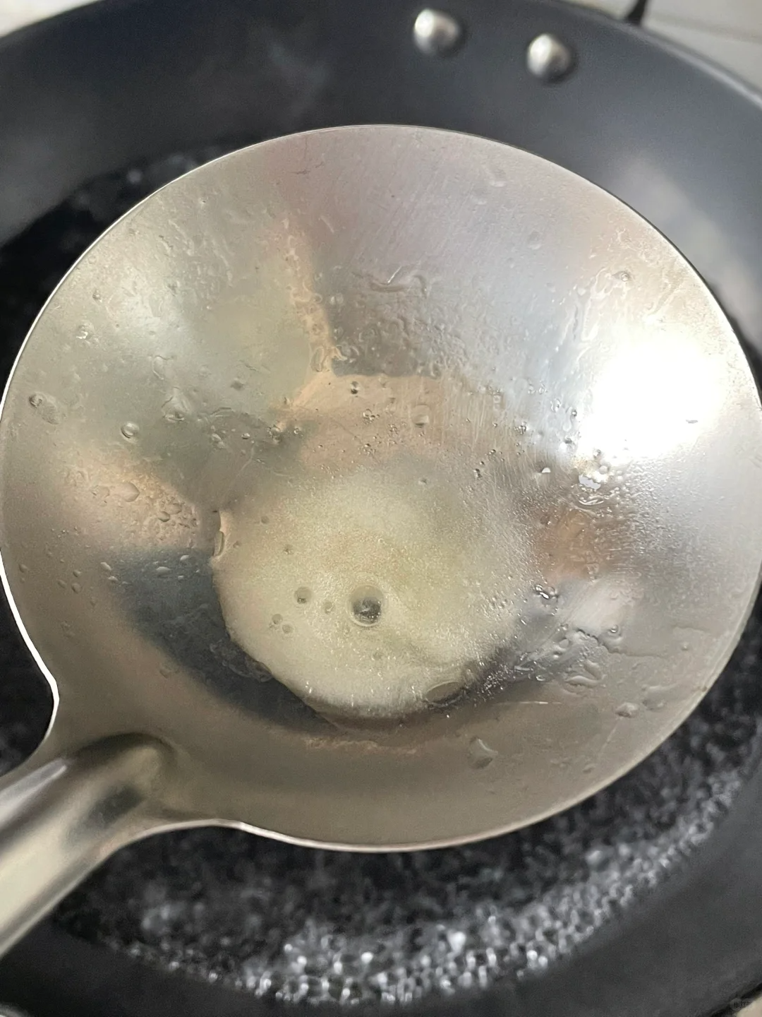 我也是后来才知道一个100%成功的秘诀,那就是用勺子来帮忙。先把锅里的水煮沸,然后把勺子烫一下,上面再喷一层油,