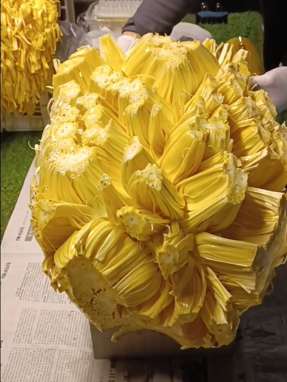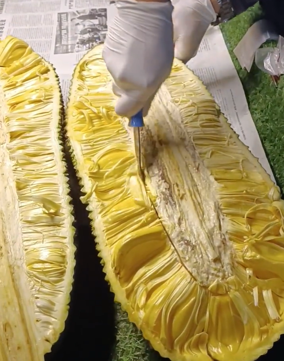 将四半菠萝蜜中间部分切除,然后把果皮一推,肉就分散开来,挨个取下来就能吃了。