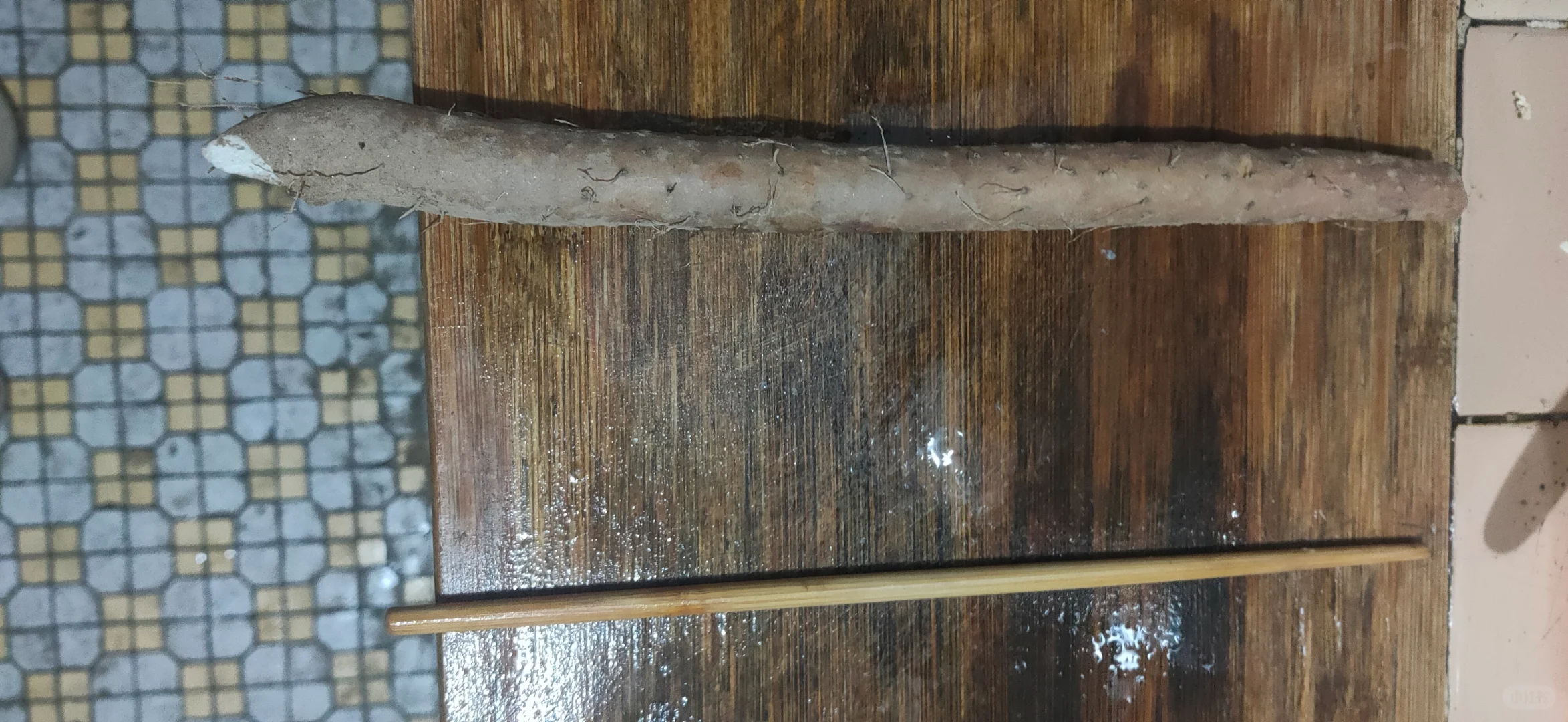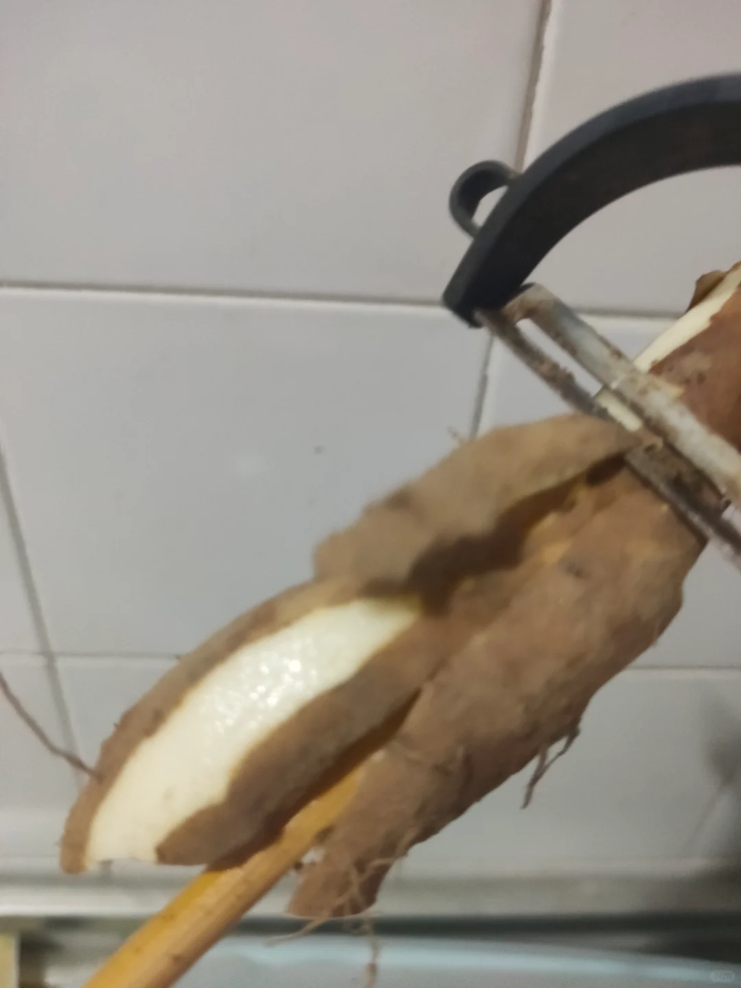 她用一根筷子,然后插在山药中,手拿筷子来削皮,就能避免手与山药接触了,切的时候就把筷子往前怼一怼,然后直接用削皮刀削皮就OK了!