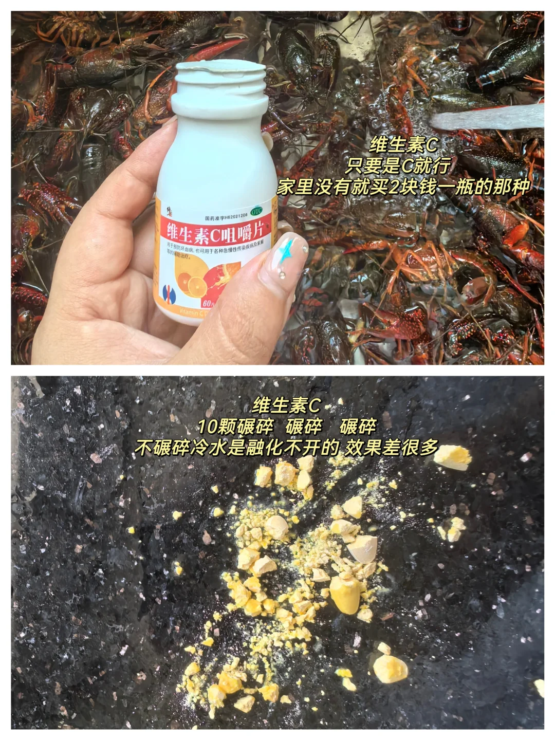 只要在洗小龙虾的时候放上20片左右的vc片,然后再倒上一点白醋,就这样浸泡5分钟左右。