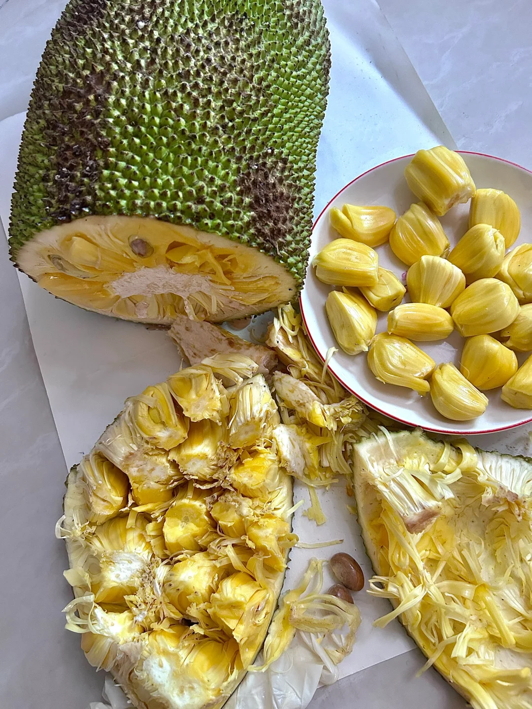 我们在超市或者菜市场买回来的菠萝蜜肉都是被商家剥好的,不仅贵还不卫生。但是自己买回来又不会剥,而且弄得满手果胶,吃起来那叫一个费劲。