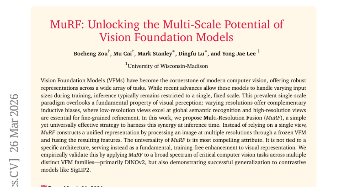 这项由威斯康星大学麦迪逊分校主导的研究发表于2026年3月的arXiv预印本平台,论文编号为arXiv:2603.25744v1。研究团队在视觉人工智能领域取得了一项重要突破,提出了一种名为"多分辨率融合"(MuRF)的新方法,让AI在观察图像时能更好地模拟人类视觉系统的工作方式。