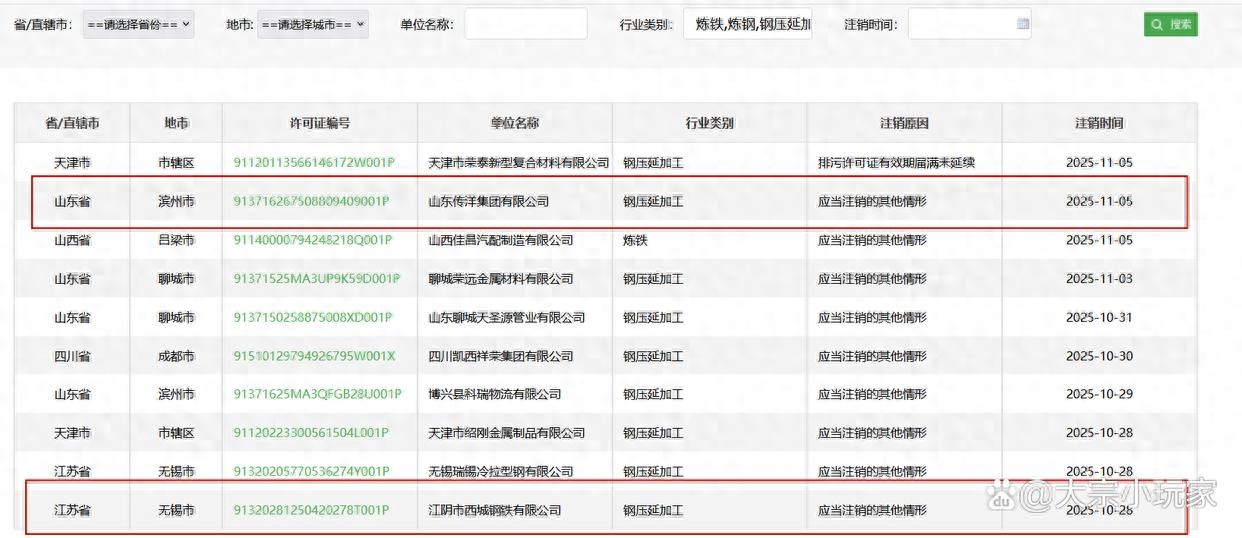 近日,全国排污许可证管理信息平台显示,山东传洋集团有限公司和江阴市西城钢铁有限公司的排污许可证均已被注销,注销理由为“应当注销的其他情形”。这一变化不仅意味着两家企业阶段性发展的终结,也反映了当前钢铁行业在绿色化、集约化转型背景下的深层趋势。