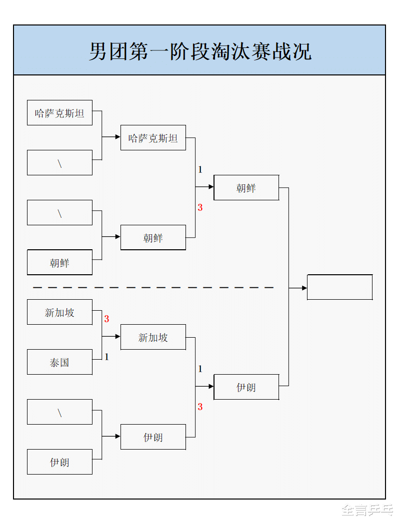 紧接着各小组的第一名进行淘汰赛,首轮新加坡、泰国展开较量,结果新加坡3-1胜出,但随后第二轮就遭遇败绩,被伊朗队3-1淘汰;另一个半区朝鲜、哈萨克斯坦都是首轮轮空,第二轮朝鲜选手发挥更佳3-1击败哈萨克斯坦。