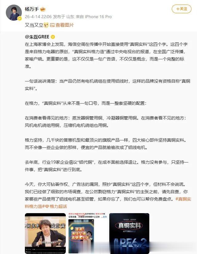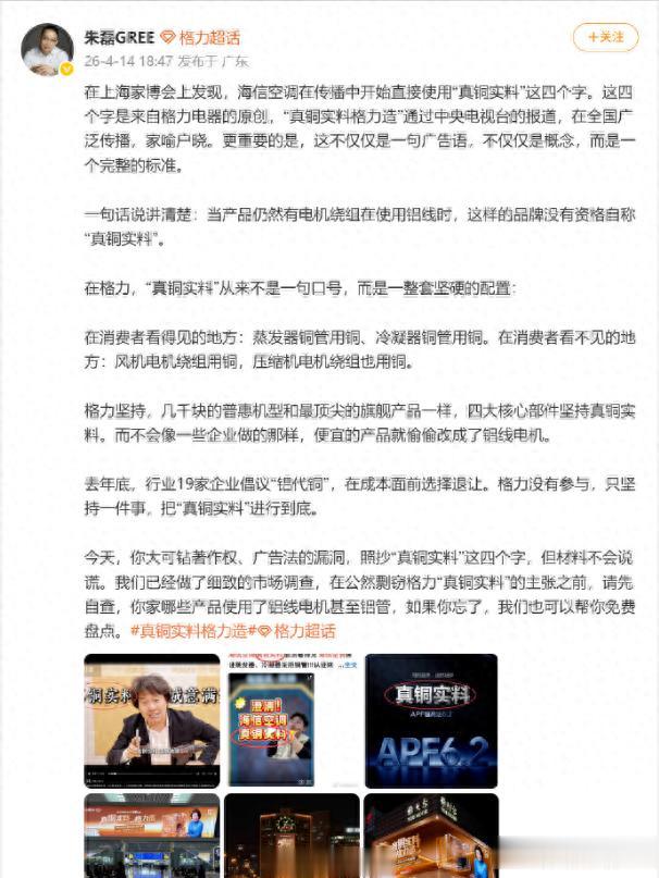 近日,格力电器(000651.SZ)市场总监朱磊在社交平台发文,直指海信空调在上海家博会上直接使用格力原创的“真铜实料”四字进行宣传,而这四个字是格力电器的原创。更指出:“真铜实料格力造”经央视报道已家喻户晓,更是一套完整的品质标准。当产品仍有电机绕组使用铝线时,这样的品牌没有资格自称“真铜实料”。