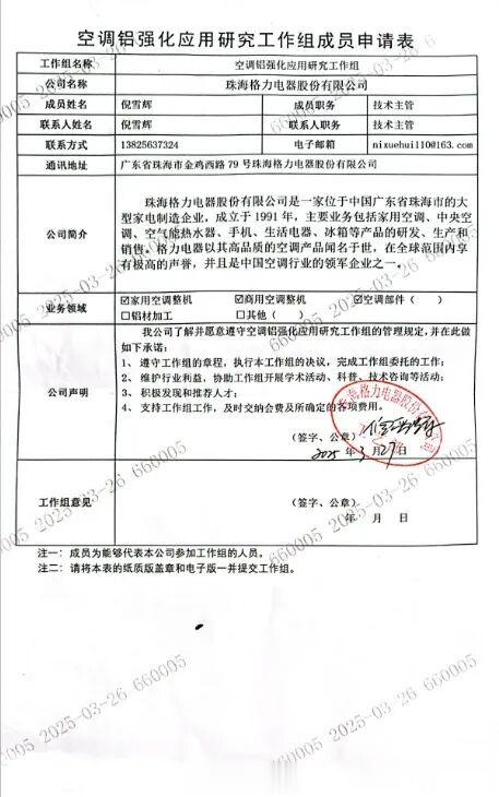对于朱磊发言,海信高管杨万手评价格力行为是“又当又立”。并附上了一张《空调铝强化应用研究工作组成员申请表》的扫描件,其公司一栏为格力电器。