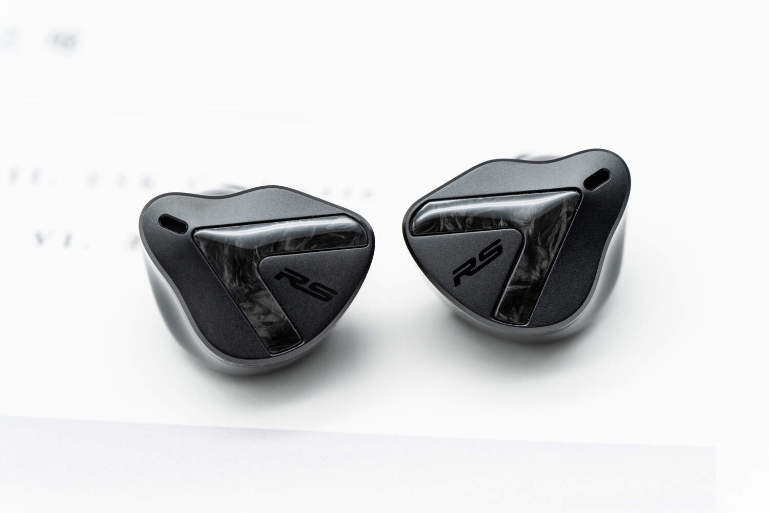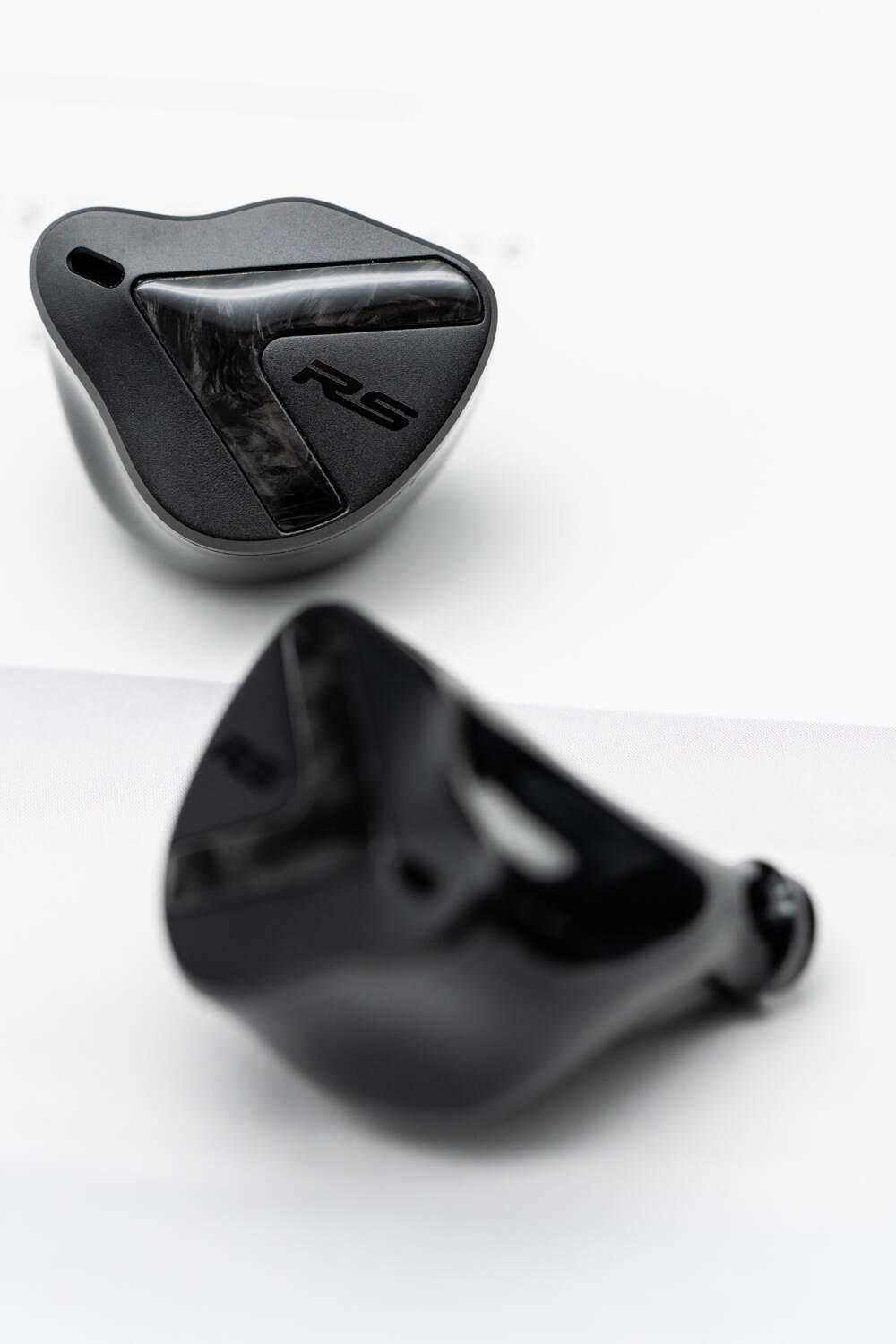 RSV一代的外观设计我挺喜欢的,色调和质感都蛮出色,见过不少人的私模更是好看;RSV-MKII的公模版本增加了更明显的设计元素,采用CNC精雕阳极氧化铝合金制作面板,其上又用锻造碳纤维做了一个V形的立体图案,很是漂亮。耳塞腔体采用3D打印来保证轻便与佩戴舒适度。整个RSV-MKII的色调是灰黑色,设计语言简洁,从视觉上强调金属和碳纤维交织的双重质感。公模的面板轮廓延续了Softears家族习惯,以符合人耳曲线为主,带来的优点是即便是公模,佩戴贴合度与舒适度都很不错;由于不是全金属的腔体,避免了冷天佩戴被冻到的同时也控制了整体重量。