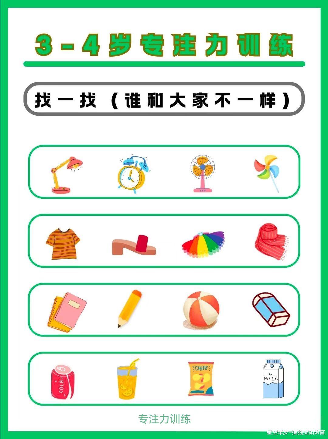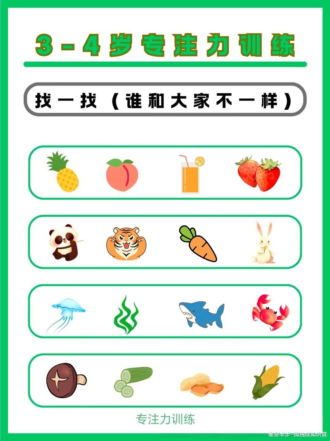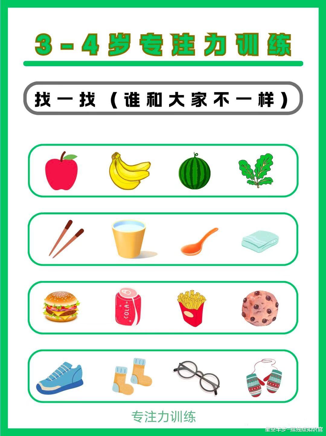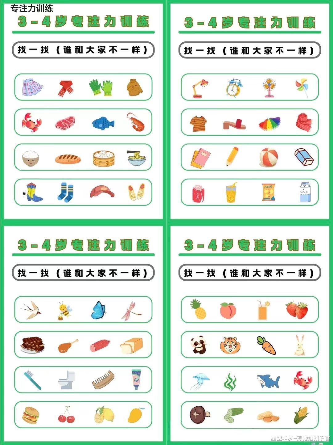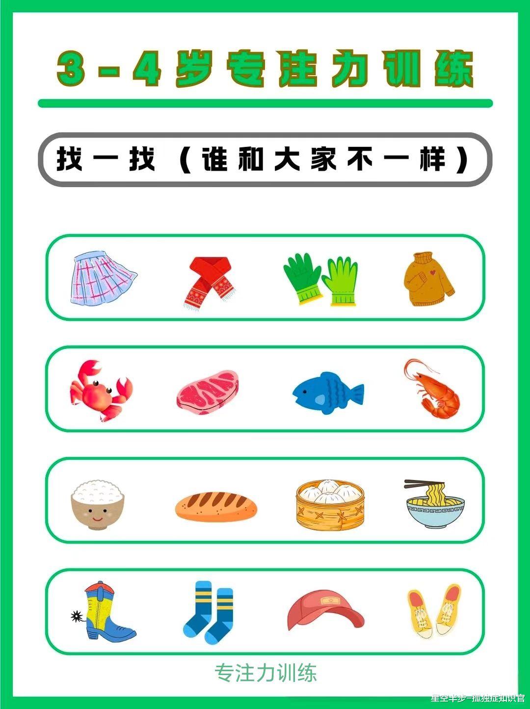 玩法超简单:每一行里找出“不一样”的那个,比如在一堆衣物里找不同,在食物里找异类,既能锻炼观察力,又能培养分类思维,娃边玩边学,完全不抗拒。
