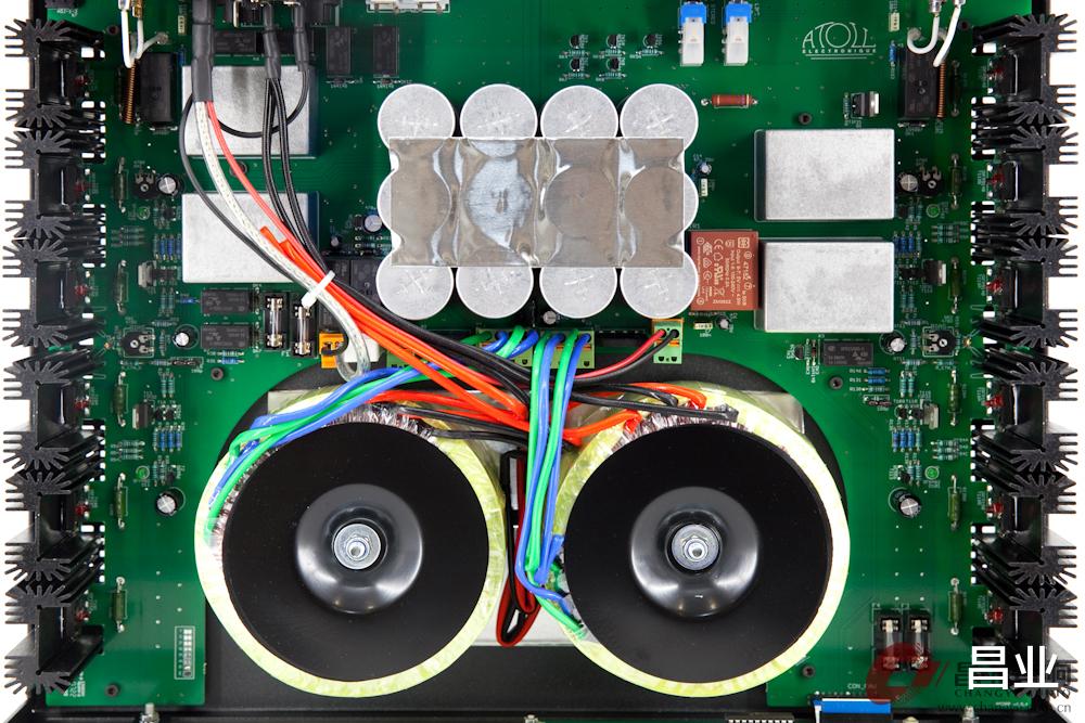 AM300为双单声道结构,每声道使用3对场效应管,各由一只440VA环型变压器供电。在滤波部分可见12只ATOLL订制的“日本化工”黑金刚电容,每只电容量为6800µF,上面贴有消除振动的箔片,AM300总电容量为83300µF。每个声道还有两个神秘的方型带金属壳屏蔽的盒子,里面封装了发烧电容等调音元件,由ATOLL向向德国Mundorf定制。
