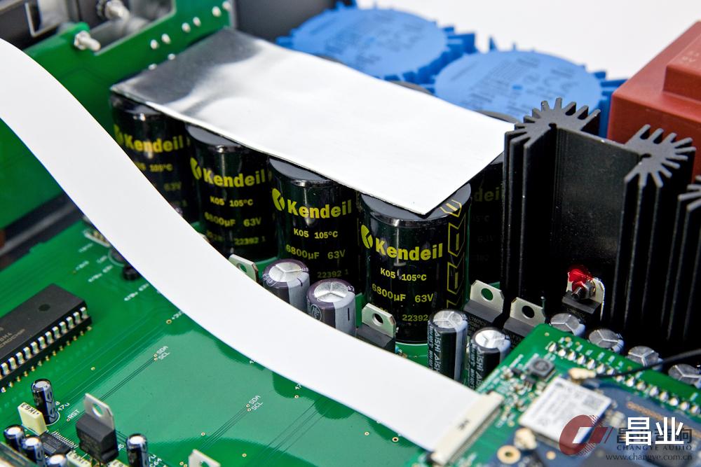 变压器旁边是整流、滤波部分,最引人瞩目的是加有防震贴片的8只意大利Kendeil滤波电容(Kendeil电容素以分析力高、透明度好而著称),ST300 Signature的电容总量高达69000µF,即使用在功率放大器上也绰绰有余,而对于数播来说则显得过于奢侈了。
