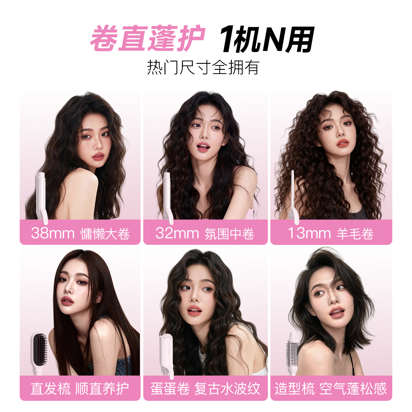o场景整合度(10/10):一款产品,集齐了6种专业替换头(13mm羊毛卷、32mm自然卷、38mm大波浪、蛋卷棒、直发梳、造型梳),真正实现了“1机=6台专业造型工具”,覆盖从精致卷发、顺直内扣到高颅顶蓬松的全场景需求。无论是日常通勤、约会派对还是出差旅行,一支就能搞定所有发型。