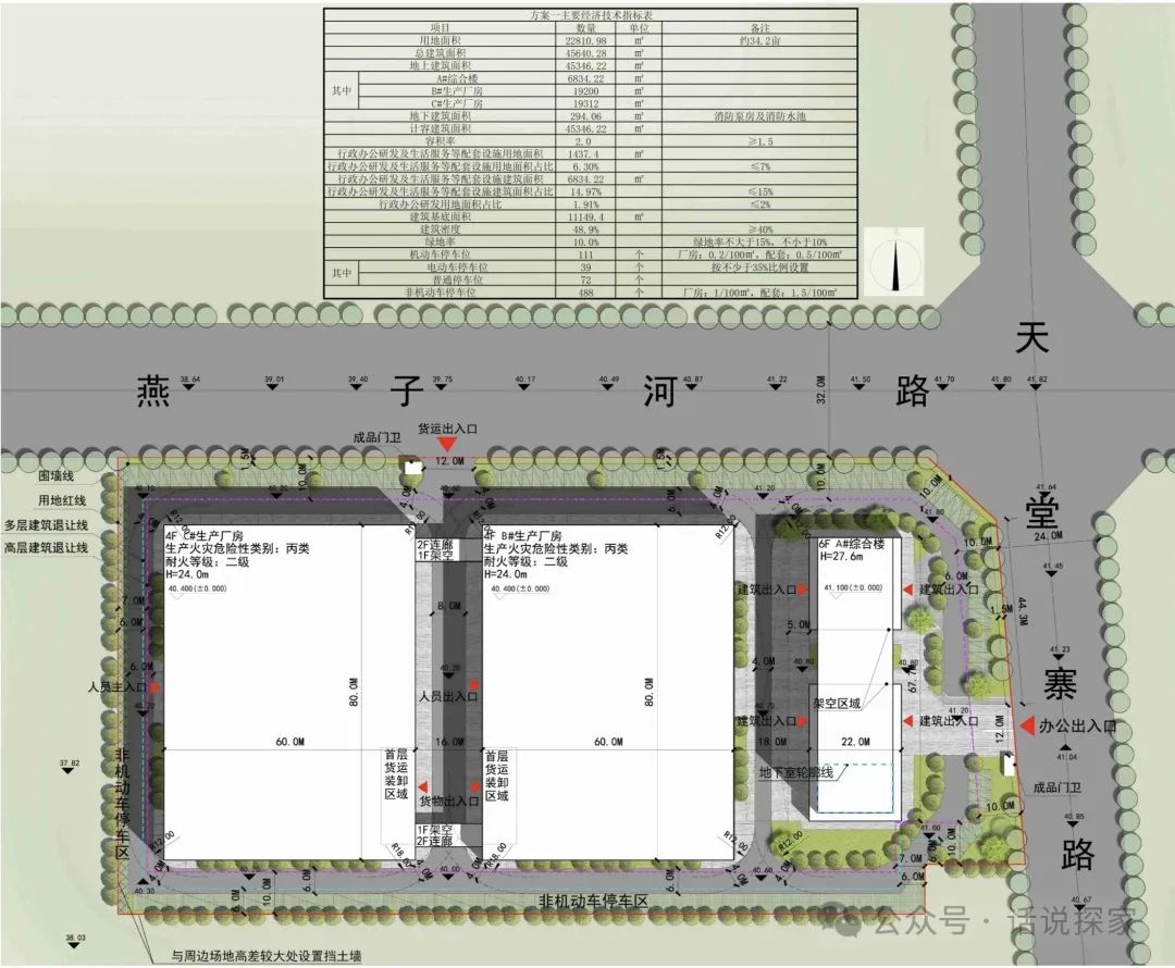 项目总用地面积为22810.98㎡(约合34.2亩);用地性质为工业用地;总建筑面积为45640.28㎡(其中地上建筑面积45346.22.㎡、地下建筑面积294.06㎡),总计容建筑面积约45346.22㎡;容积率2.0;建筑密度48.9%;绿地率10.0%;机动车停车位111个(其中地上111个)。