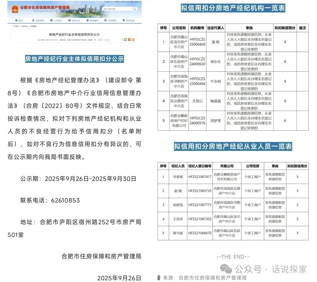 近日,合肥市住房保障和房产管理局发布《房地产经纪行业主体拟信用扣分公示》,5家房地产经纪机构和5名从业人员因不良经营行为被信用扣分。