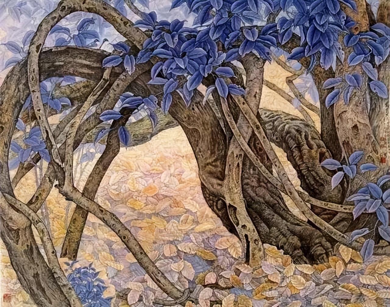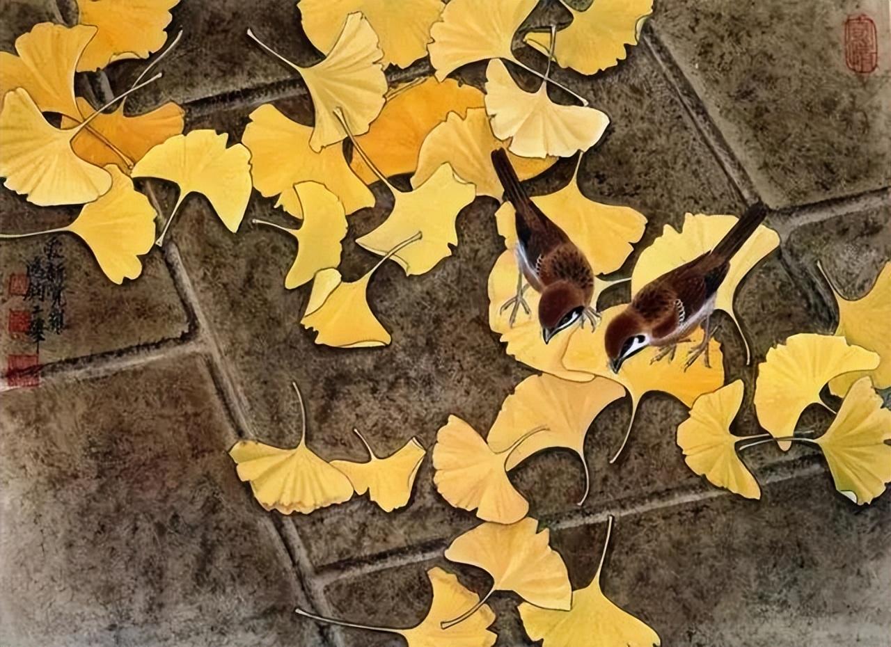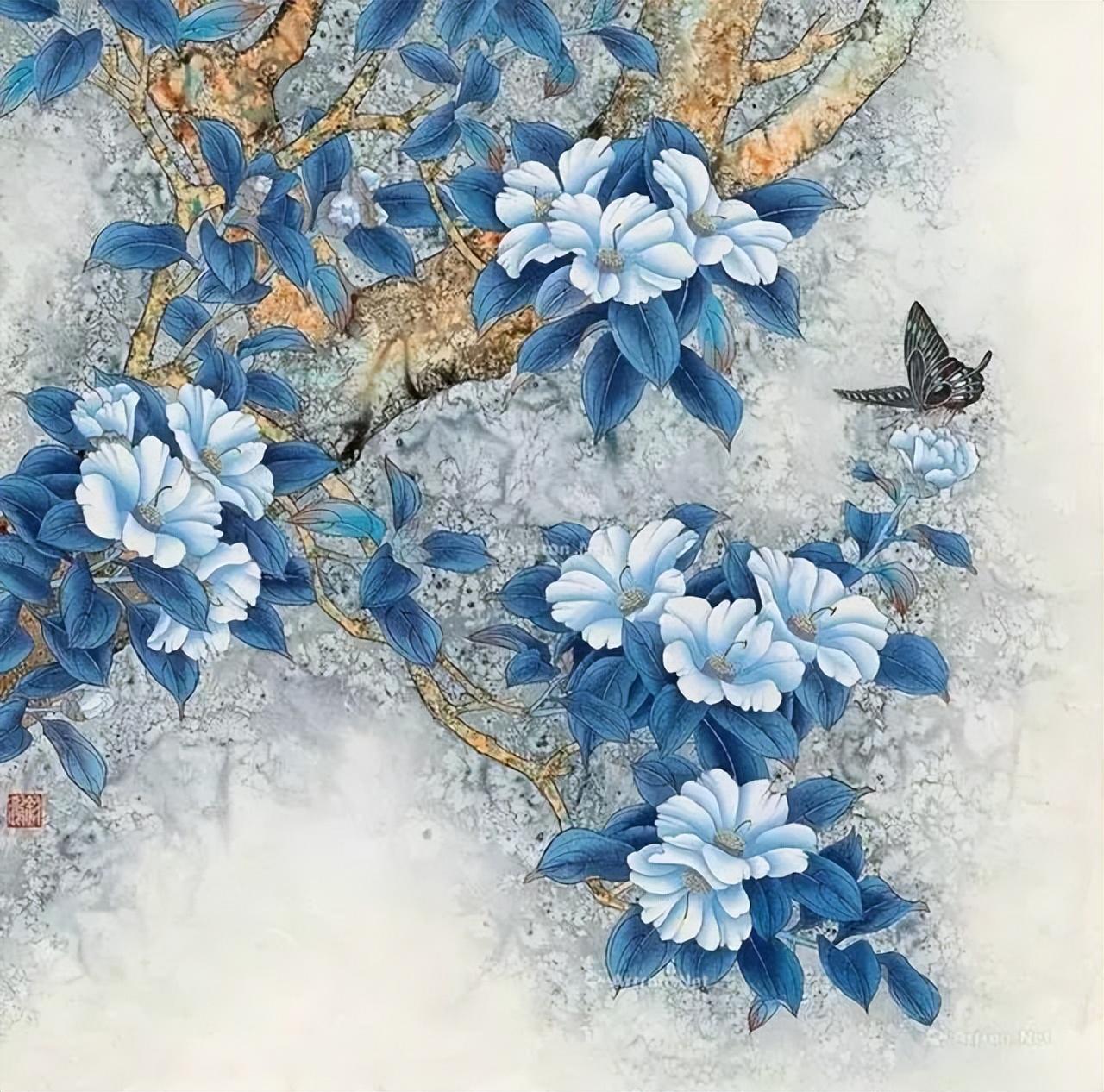 为此,他常年深入自然,观察花鸟的生长习性、形态变化,感受四季更迭中自然的韵律与生机。从春日盛开的牡丹到秋日金黄的银杏,从盛夏怒放的牵牛到寒冬傲立的霜叶,自然中的每一处细节都成为他创作的灵感源泉。在创作过程中,他并非简单地对自然进行复刻,而是在精雕细刻中注入自己的思想感情,通过艺术加工让作品达到“高于生活”的艺术效果,这一创作理念,彻底打破了传统工笔花鸟画“重形似、轻神似”的局限,极大地扩大了花鸟画的思想容量。