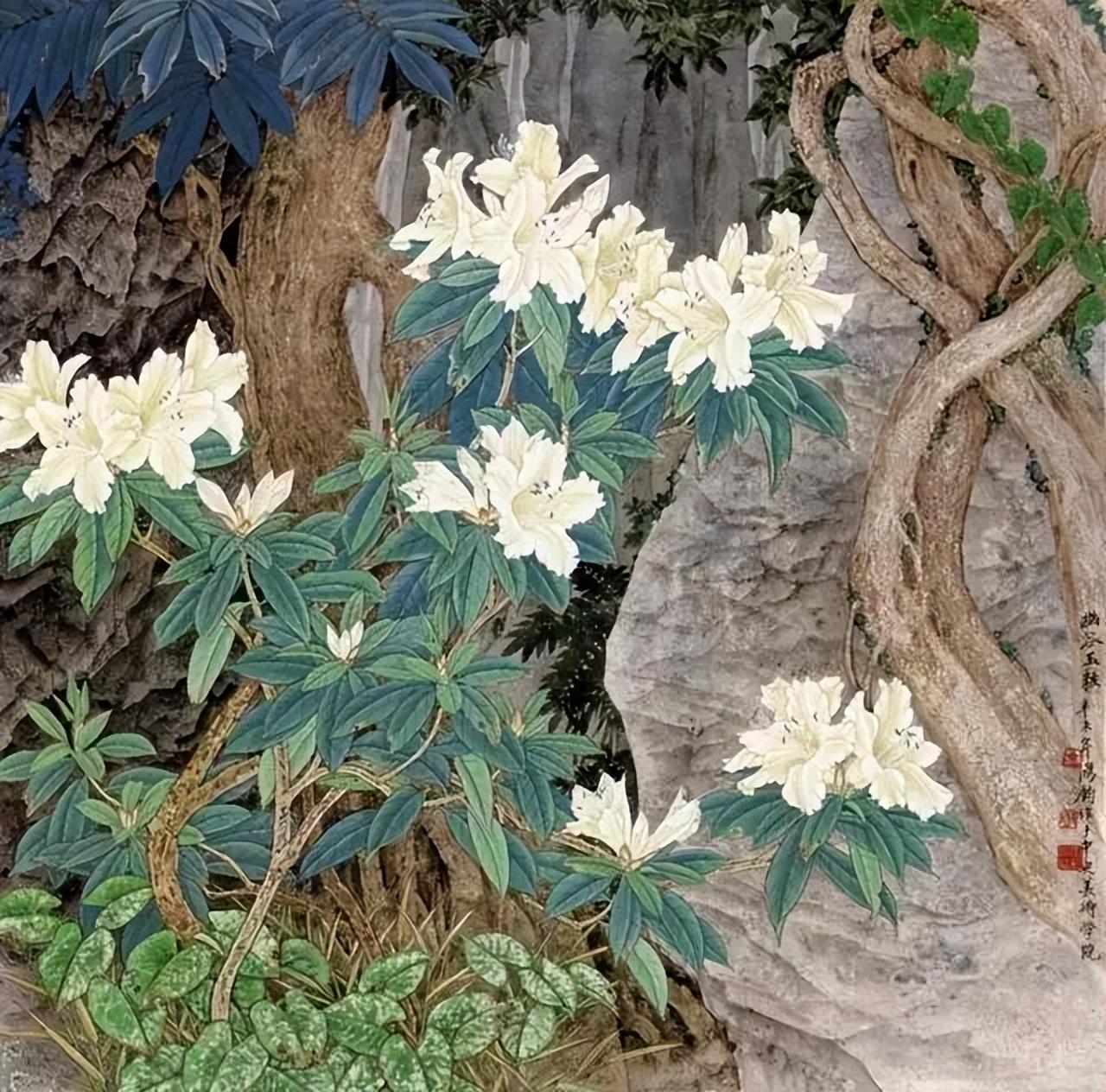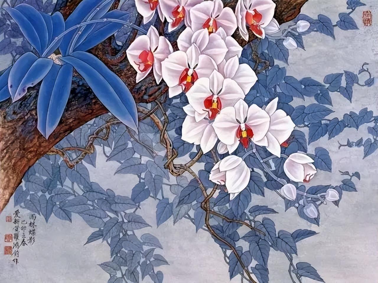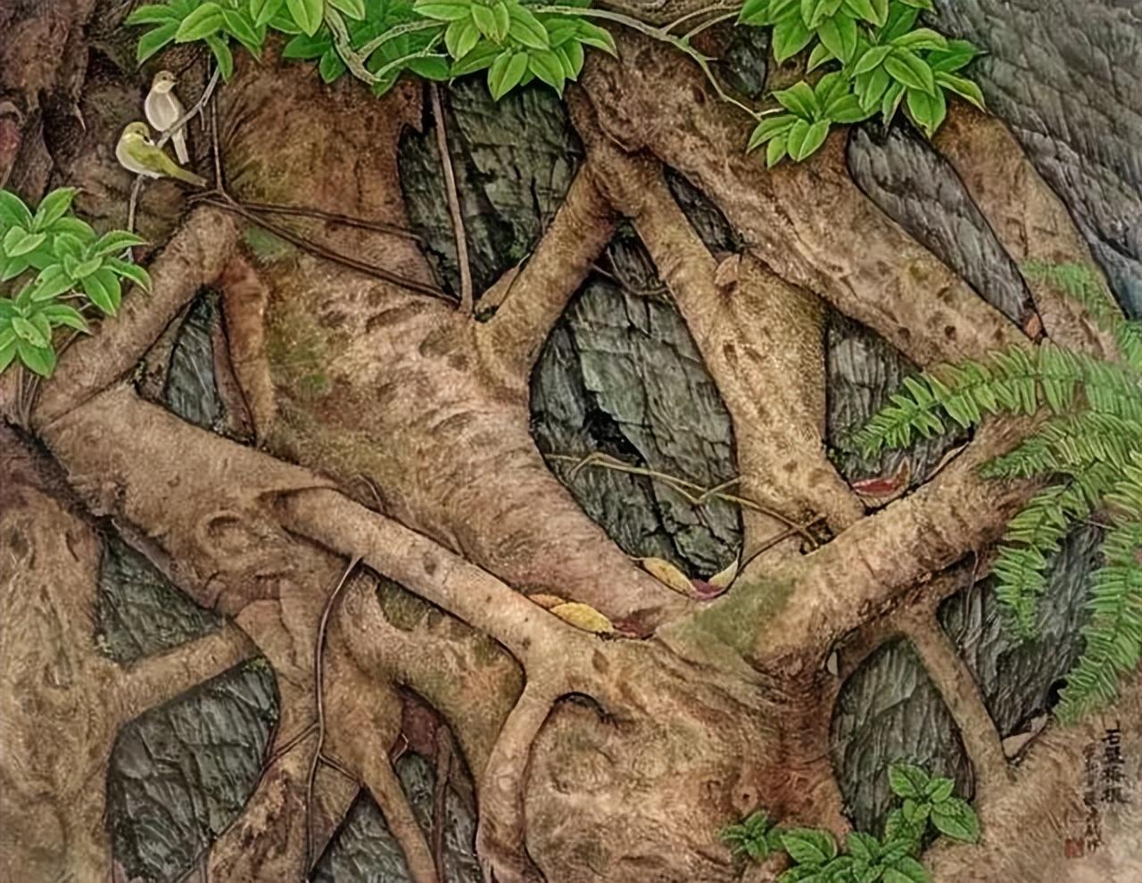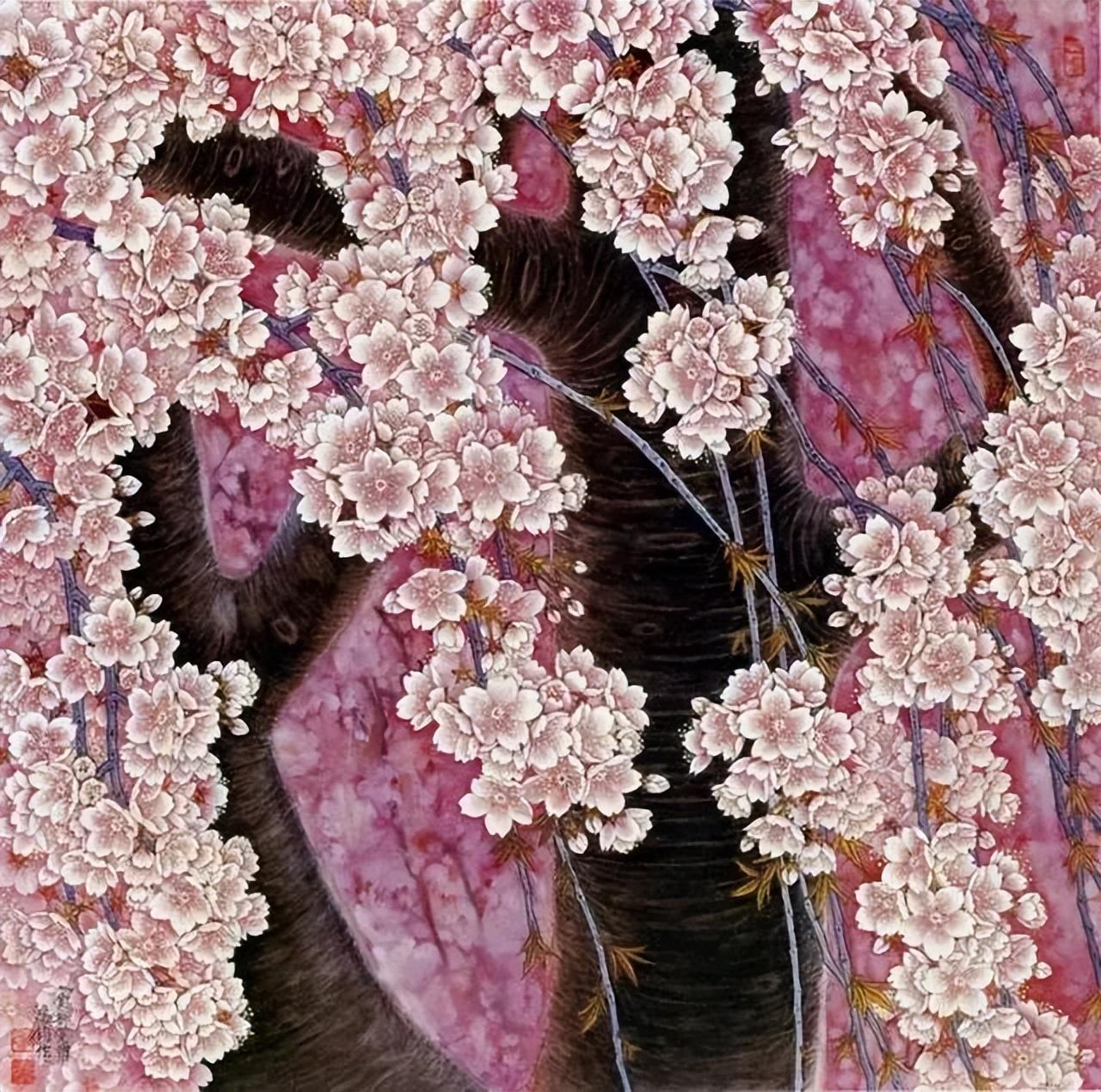在他的作品中,我们既能看到传统工笔重彩的细腻与典雅,又能感受到强烈的时代气息——他笔下的花鸟,不再是古代文人雅士闲情逸致的寄托,而是与现实生活、时代精神紧密相连的艺术符号。无论是对生命力量的赞颂,还是对自然之美的敬畏,都契合了现代社会人们对精神文化的需求,让工笔重彩花鸟画这一古老的艺术形式在当代焕发出新的活力。