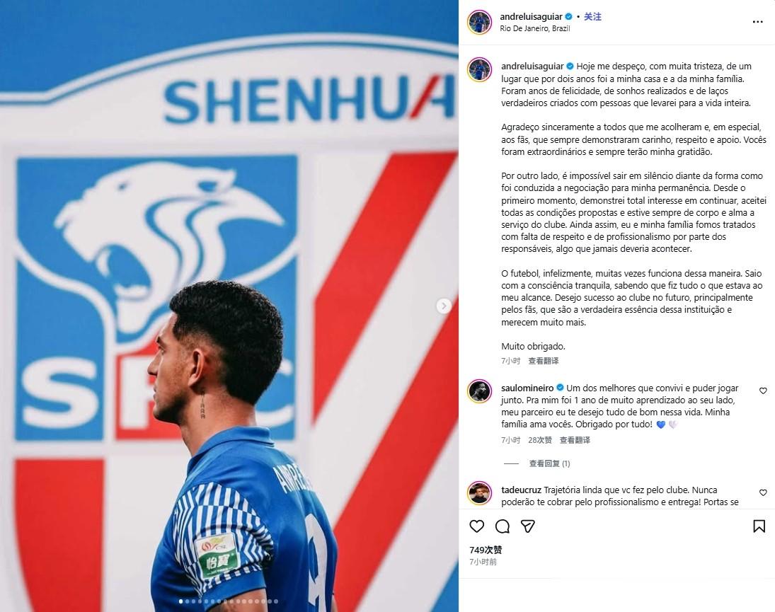 路易斯在确定要离开申花之后发文: