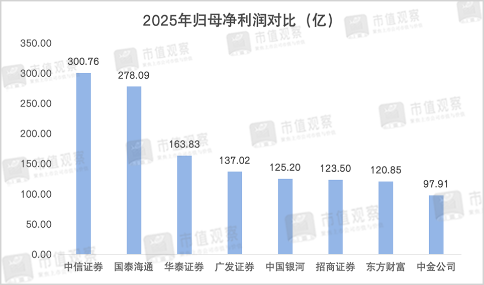 当前,券商行业前三较为固定,围绕第4名的排名争夺则相对激烈,尤其是在归母净利润维度,2025年广发证券替代招商证券跻身前四,后者则退居第6。