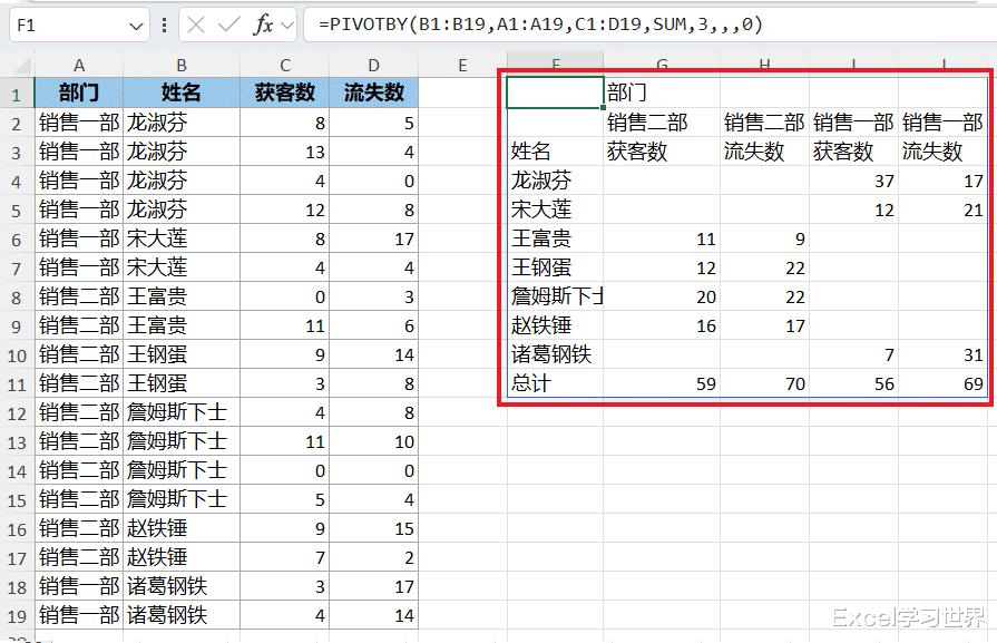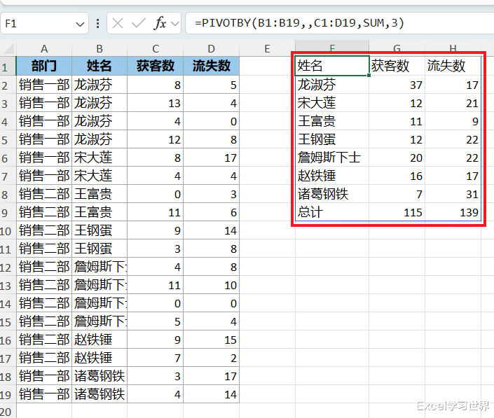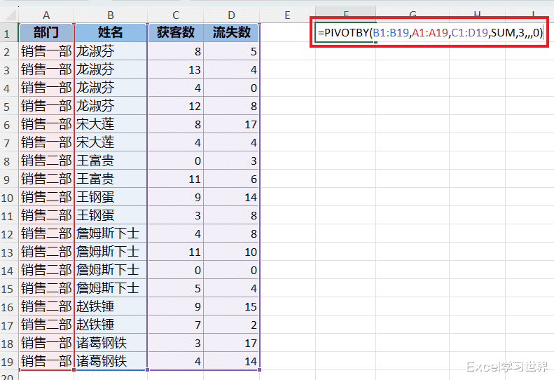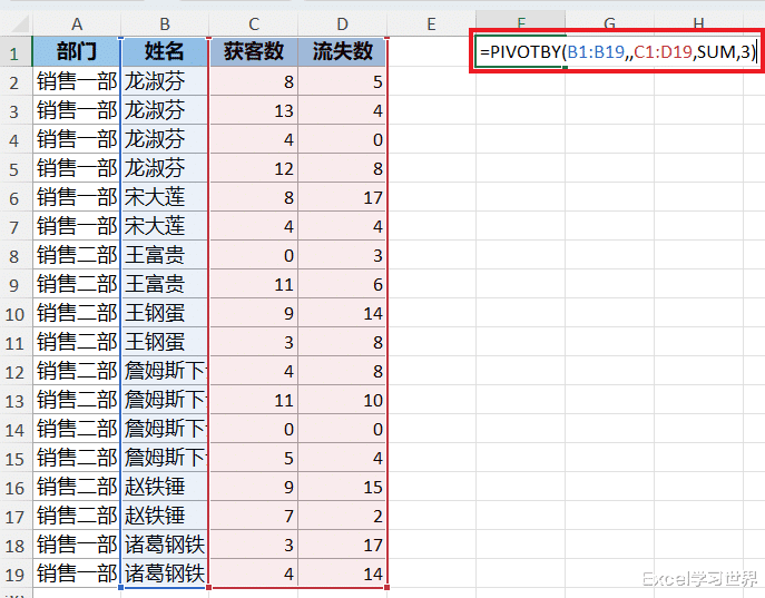 接下来看公式 PIVOTBY(B1:B19,,C1:D19,SUM,3) 的含义。