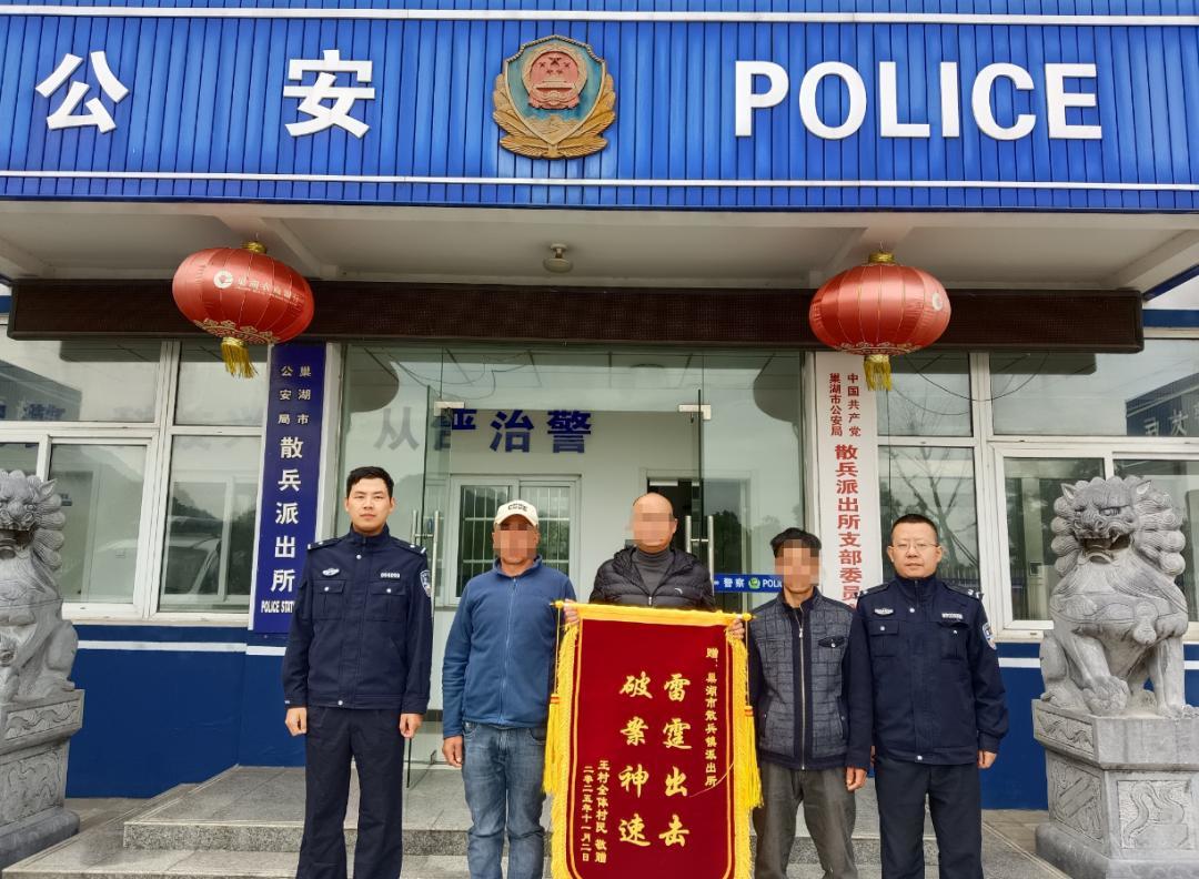 11月4日上午,当得知案件告破,丢失的古石器均被找回后,几位村民满心欢喜,将一面写有“雷霆出击 破案神速”的锦旗送到散兵派出所民警手中,由衷地表达着谢意。