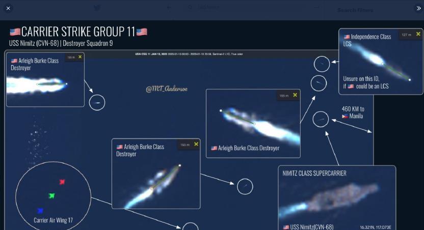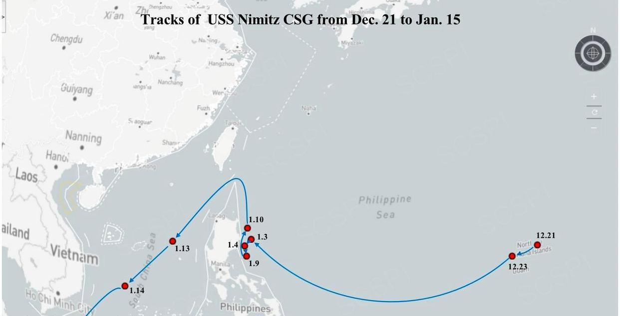 综合AIS信号以及卫星图像显示,“尼米兹”号航母打击群在1月12日夜晚进入南海活动,并于1月13日在我国黄岩岛西北约150公里处进行了8个小时的演练。按照“惯例”,“尼米兹”号航母打击群本应该在南海晃荡半月以上,并进行大规模的军事训练,以体现美国在南海的军事存在。然而在1月13日之后,“尼米兹”号航母打击群的突然调转了航向,并以25节的高速快速向西南方向行进,并最终离开了南海。