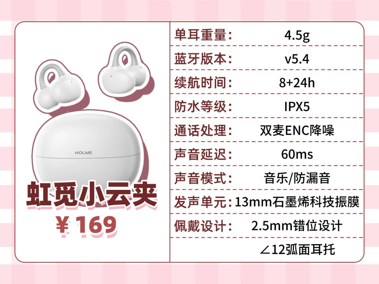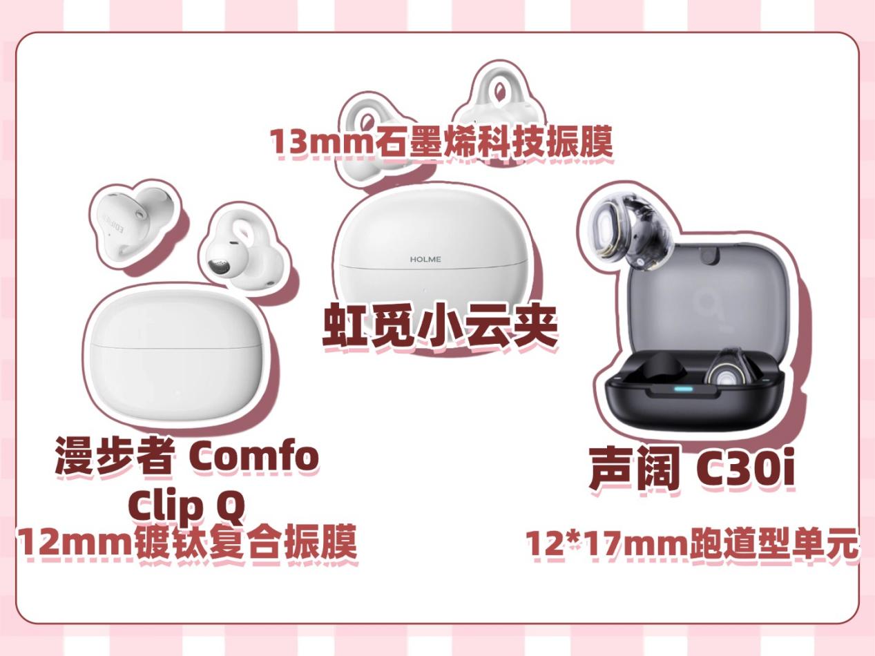 虹觅小云夹:这款耳机戴着是真舒服,声音清晰自然,还搭载了超实用的防漏音模式,整体性价比很高,适合对耳机有要求大技能预算不太多的朋友。