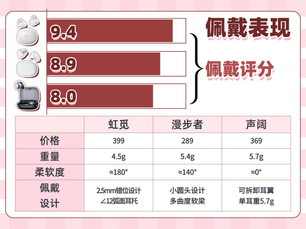 虹觅小云夹:这款耳机在佩戴设计上藏了不少巧思:单耳仅 4.5g的重量,拿在手里轻得几乎没存在感,戴久了也不会压耳朵。而且它还做了∠12 弧面耳托的电池设计,能刚好贴住耳朵后方,让贴合度和舒适度都上了一个台阶。另外,前高后低的 2.5mm 错位设计也很贴心,能让耳机顺着耳朵形状自然贴合,戴在头上特别稳固。
