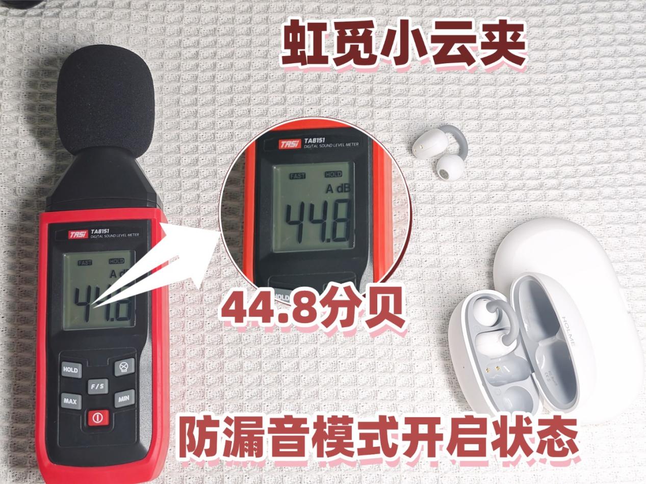 虹觅小云夹:在安静的屋子里做测试时,我特意打开了小云夹的防漏音模式,结果发现它最大漏音才49.4分贝。讲真,我测过那么多耳夹式耳机,就属它这防漏音能力最绝,完全不用担心声音外漏影响到别人。