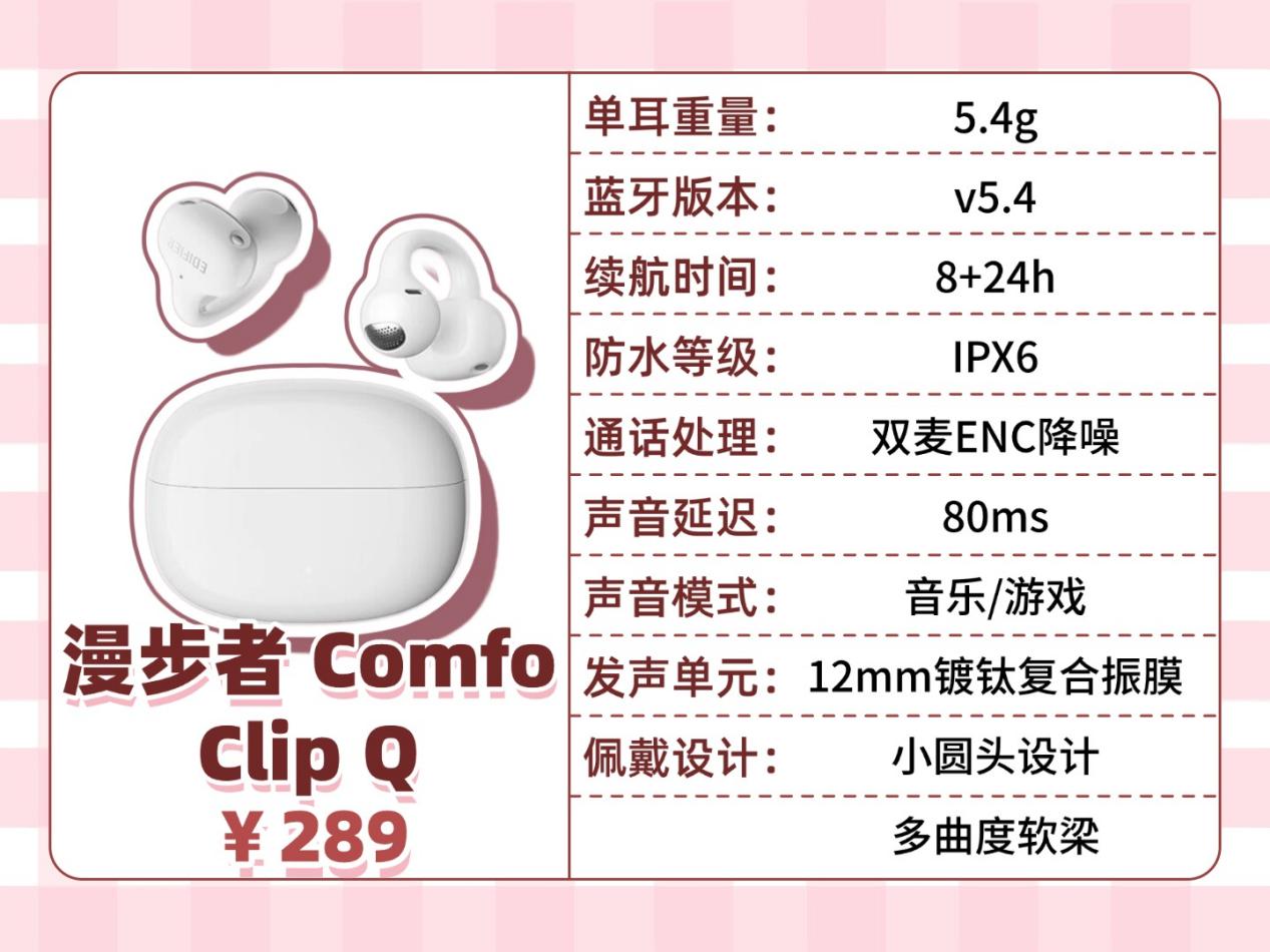 漫步者 Comfo Clip Q:从配置来看,这款耳机性能表现出色。它不仅搭载了蓝牙 5.4 芯片,还具备双麦 ENC 通话降噪,能确保通话清晰;IPX6 防水等级让使用更省心,单次续航达 8 小时,搭配耳机仓总续航可达 24 小时,同时还支持常规一拖二功能,实用性拉满。