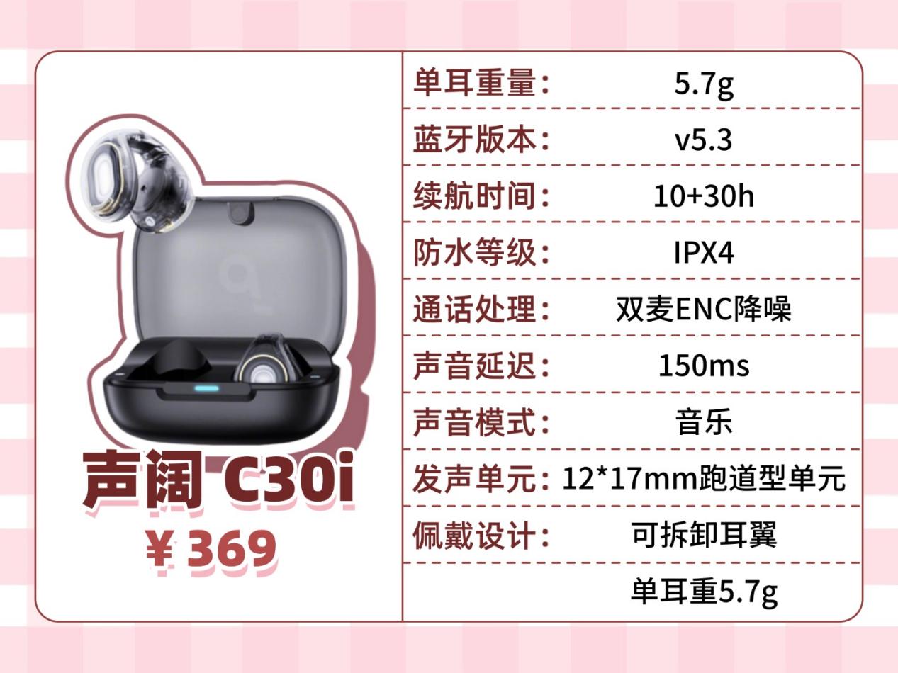 声阔 C30i:从整体来看,这款耳机的性价比挺普通的。它能支持常规的一拖二功能,也用了蓝牙 5.3 芯片,不过防水能力比较弱,只有 IPX4 等级,日常使用时碰到溅水得小心处理才行。
