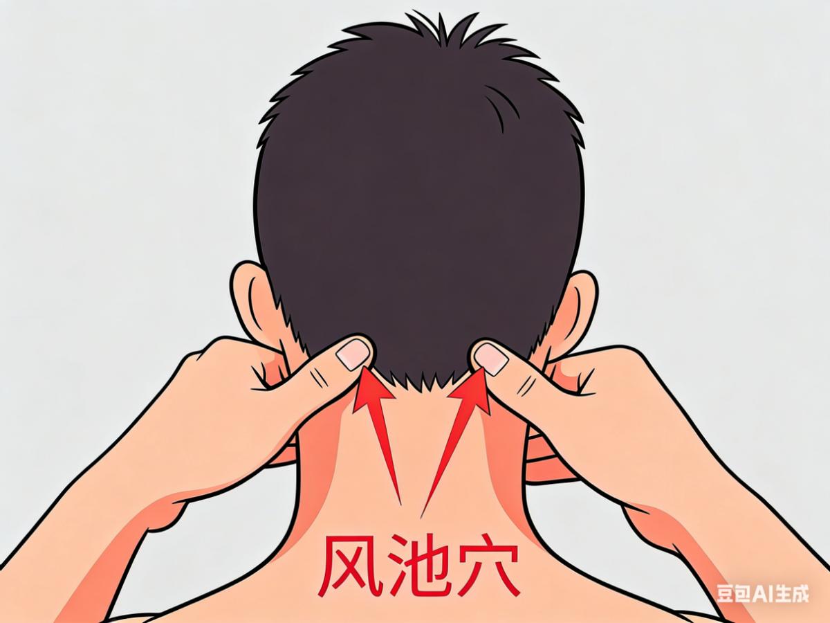 ②点按风池:(枕骨下,胸锁乳突肌与斜方肌上端之间凹陷处)用拇指指腹按揉,有酸胀感,可缓解头颈僵硬,改善头面部供血。