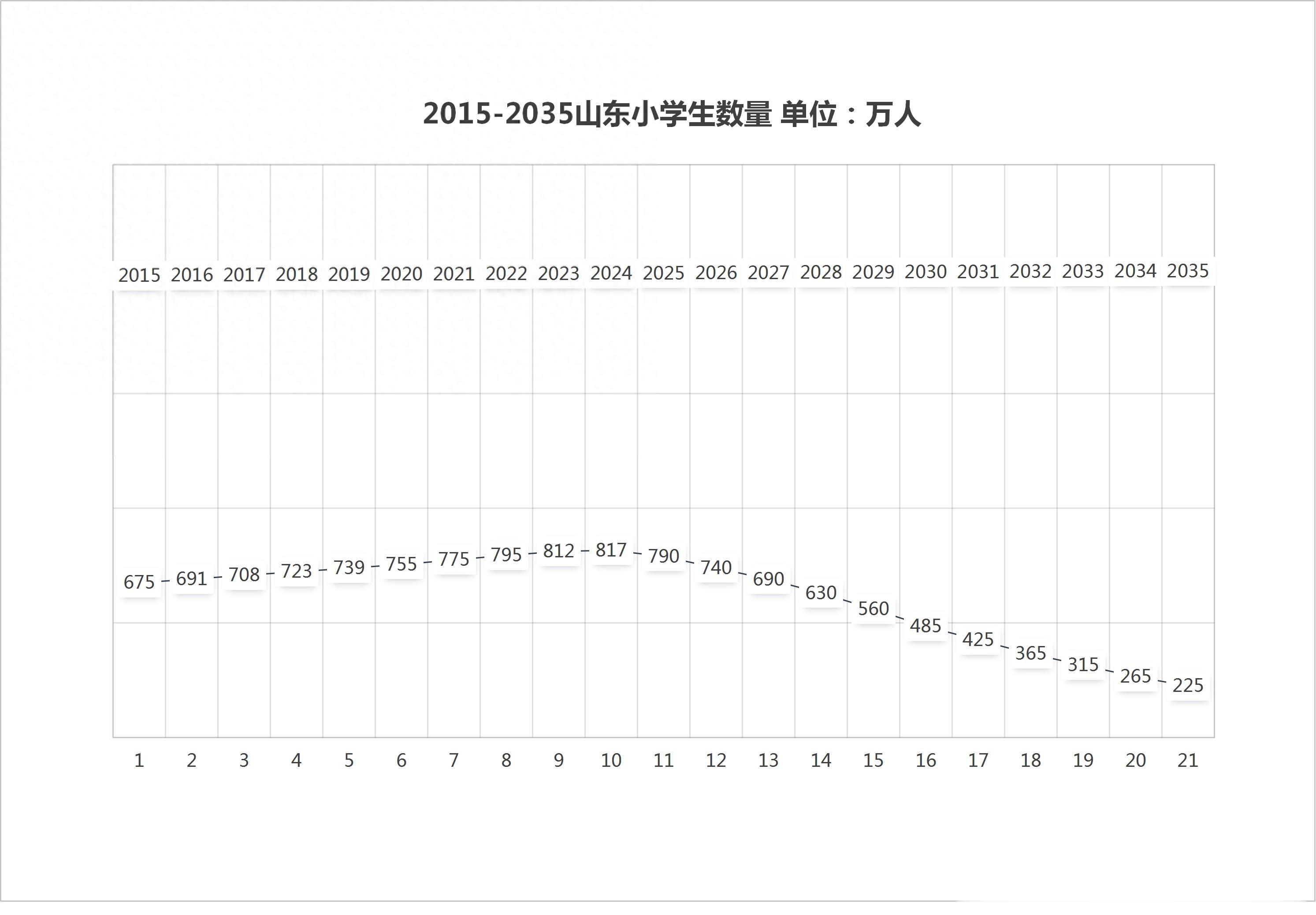 这些数据均来自官方权威渠道,虽然前面博主说得略有夸张,但是也八九不离十,山东小学生数量在2024年达峰,这一年是817万,从第二年也就是2025年开始下滑,2030年较峰值减少超过40%,到2035年减少70%-75%。换句话说,10年之后山东小学生数量每4个就要减少3个,按照这个比例下去,47万小学老师将富余35万。