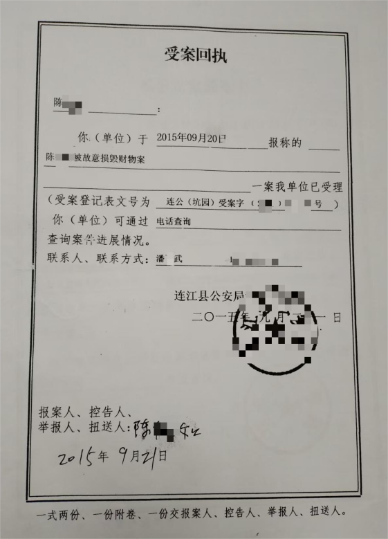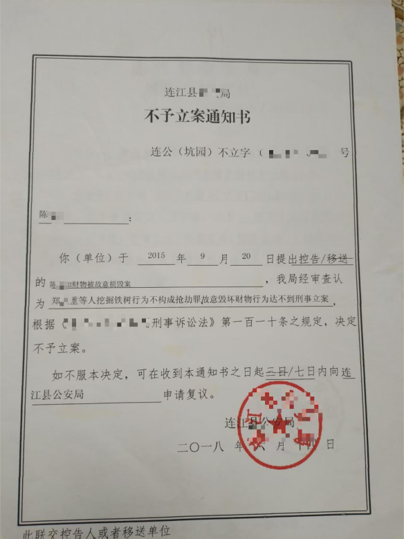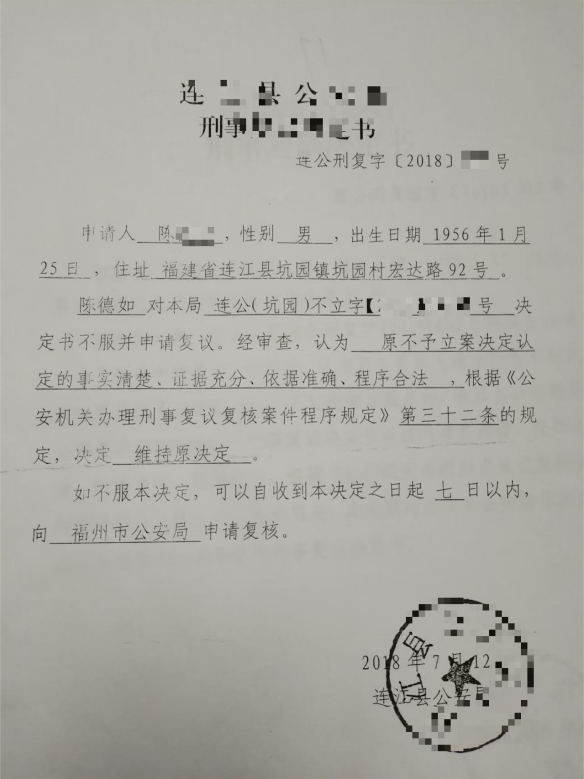 2018年6月14日,连江县办案单位出具《不予立案通知书》,认定郑某重等人行为不构成抢劫罪、故意毁坏财物罪未达刑事立案标准;陈老先生申请复议,连江县办案单位维持原决定;他又向福州市办案单位申请复核,2018年8月1日,福州市办案单位同样维持不予立案决定。