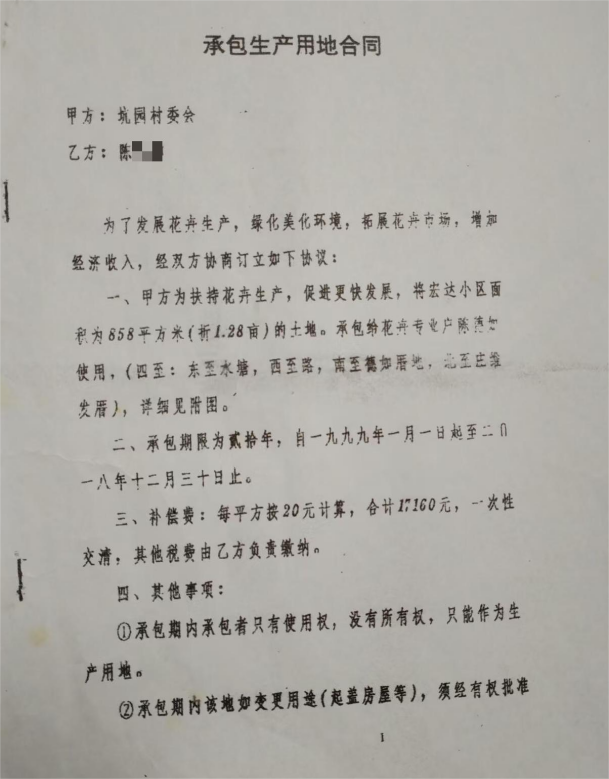 1999年1月1日,陈老先生与连江县坑园镇坑园村委会签订《承包生产用地合同》,合法承包宏达小区858平方米土地,用于花卉种植,承包期限至2018年12月30日,合同经镇行政单位见证,合法有效。2012年,其三女陈女士(现定居台湾)入股投资,父女二人投入大量人力、财力培育苏铁树。至2015年8月,基地内已种植大小苏铁树2500多株,依据同期厦门国家公园采购价核算,总价值493.2万元,属于受《宪法》《民法典》《农村土地承包法》明确保护的合法私有财产。