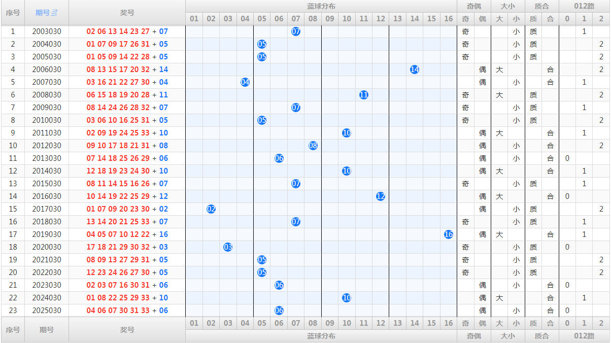 七、历史同期,蓝球开奖号码和走势图(历史数据演示):