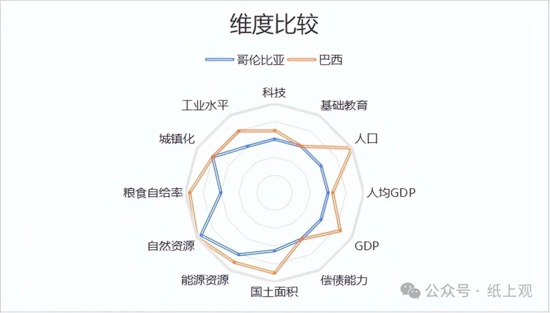 今天我们来了解巴西,它是南美唯二、拉美唯三的区域性大国。先上一个维度比较图。