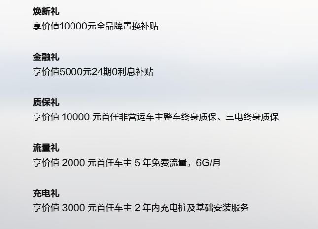 还包含2年内充电桩及基础安装服务(价值3000元)以及5年免费流量(每月6G)。