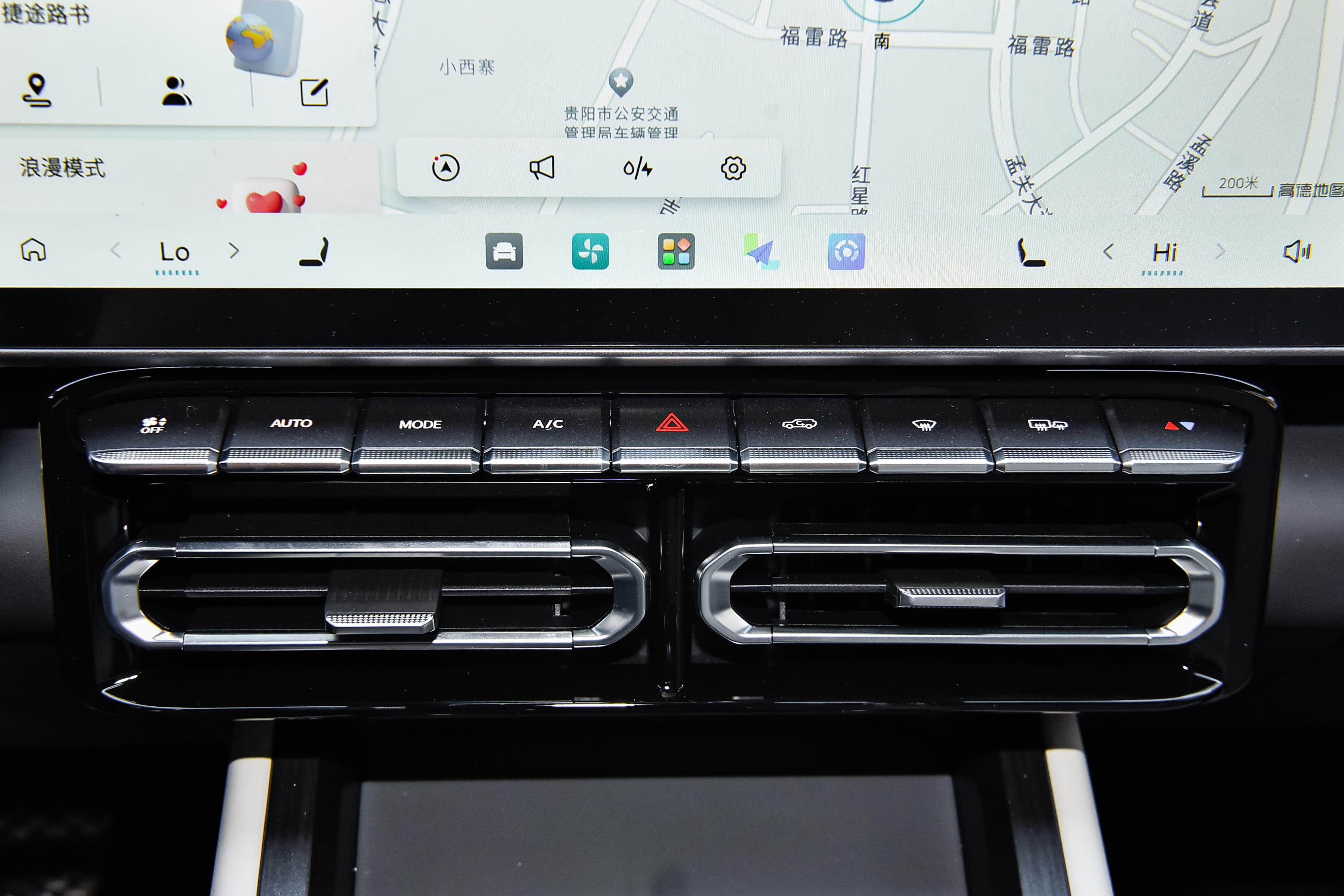 中控屏下方配有一排物理按键,常用的空调控制等功能都可以按键操作,比较方便,水晶档把造型精致,提供驾驶模式选择旋钮,副驾前方还提供了越野拉手和开放式储物槽,设计思路向硬派越野看齐。