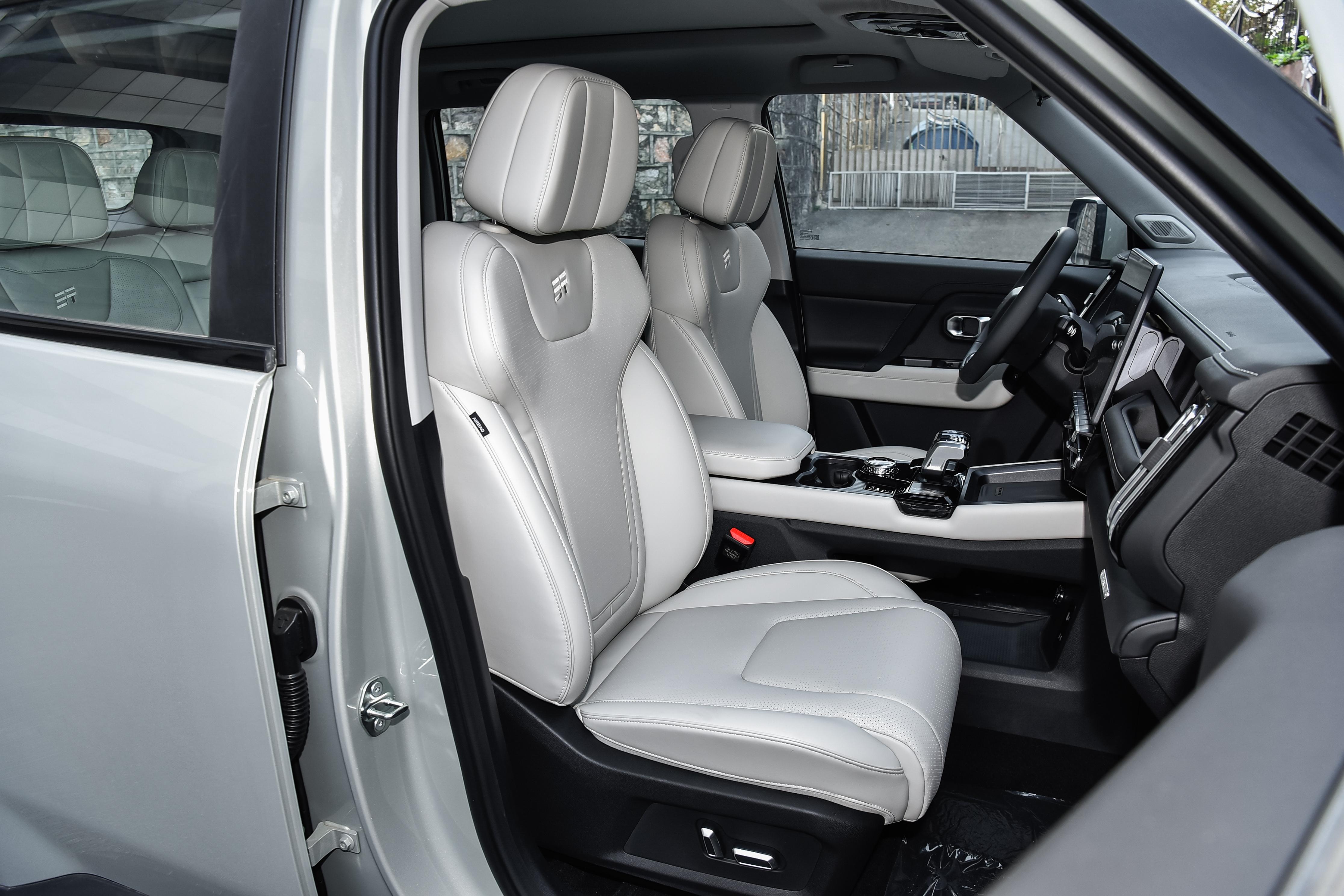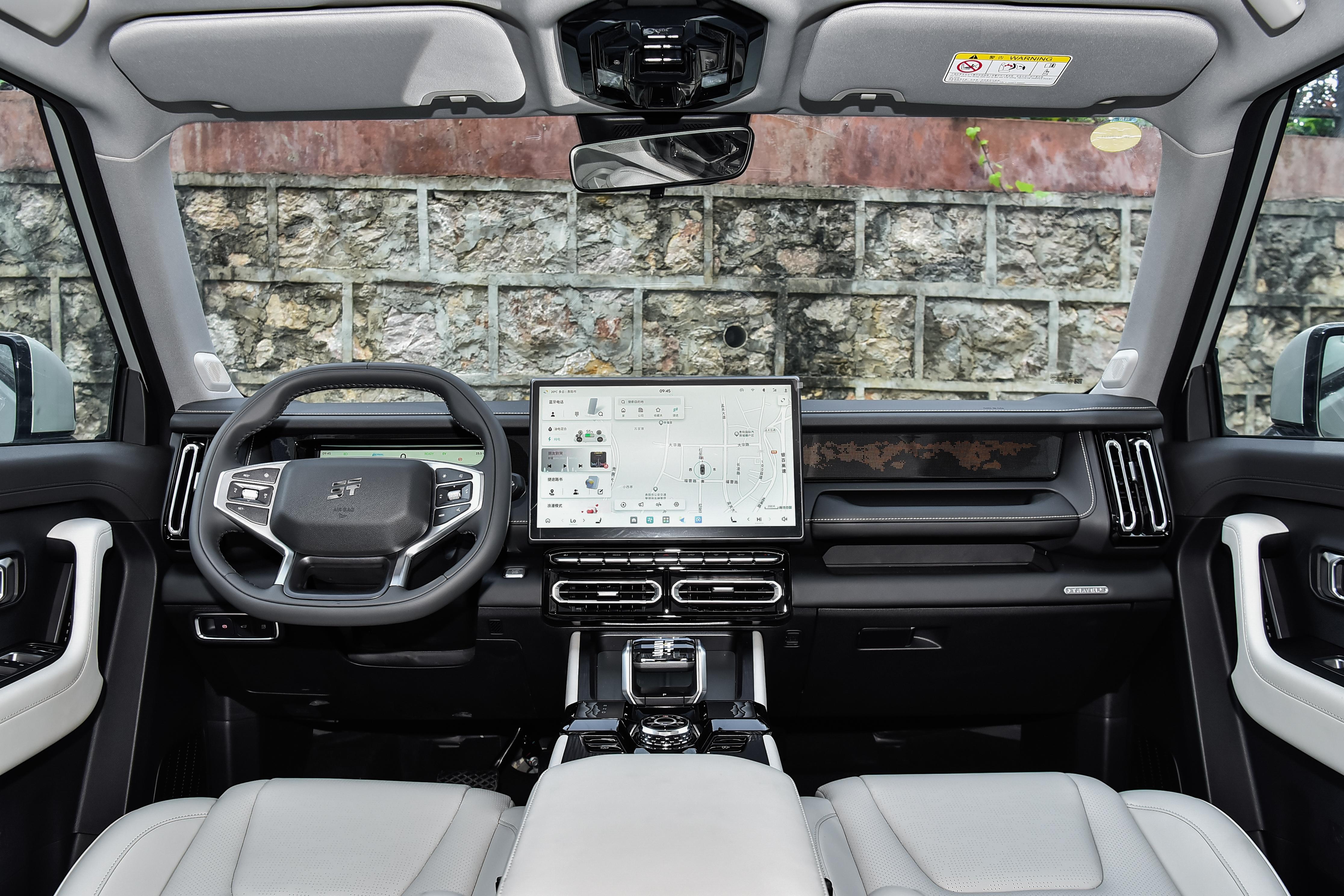 进入车内,采用环抱式座舱设计,中控台用平直线条打造,风格硬朗,跟方盒子造型相得益彰,配备10.25英寸全液晶仪表与15.6英寸悬浮式中控屏,搭载高通骁龙8155芯片,屏幕显示效果细腻,触控操作流畅自然,UI界面也比较清爽,TOUR OS 2.0系统,支持50+旅行场景、1000+旅行权益和15000+旅行路书。配备智能语音控制系统,支持连续指令识别,精准度和响应速度都挺高。