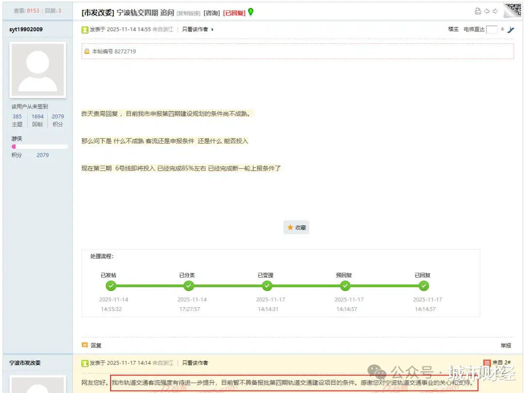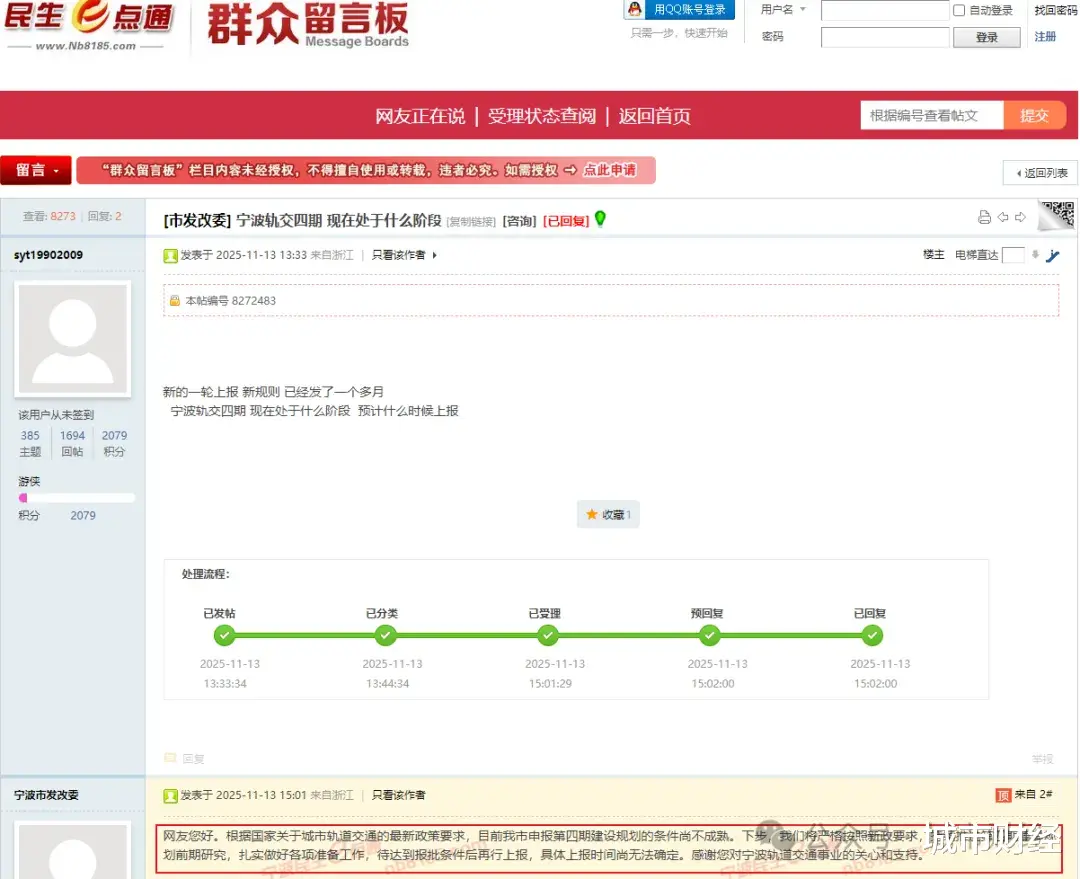 去年11月份有网友在宁波民生e点通问政平台咨询关于地铁四期规划申报事宜。