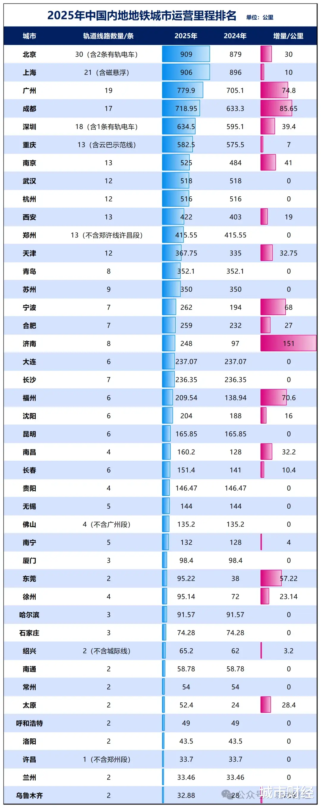 上海、北京的运营里程都已突破900公里,广州、成都、深圳、武汉、杭州等城市也纷纷进入500公里级别。