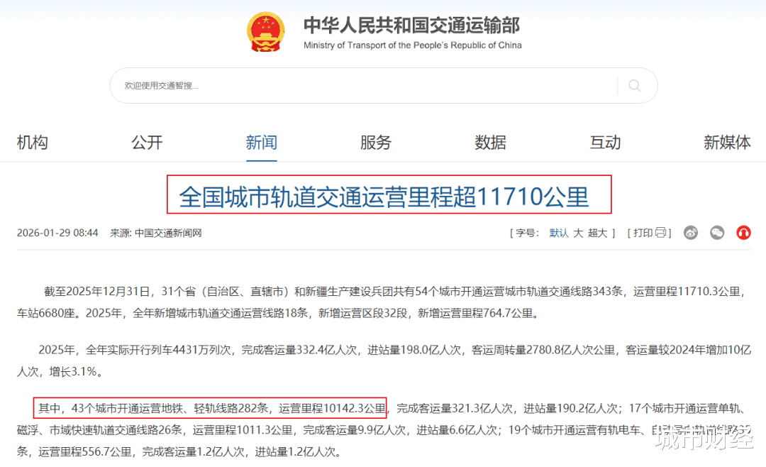 各类地铁城市总运营里程突破10000公里。